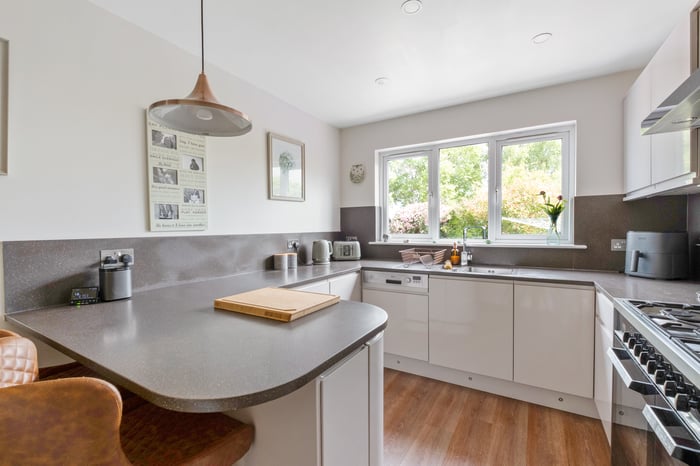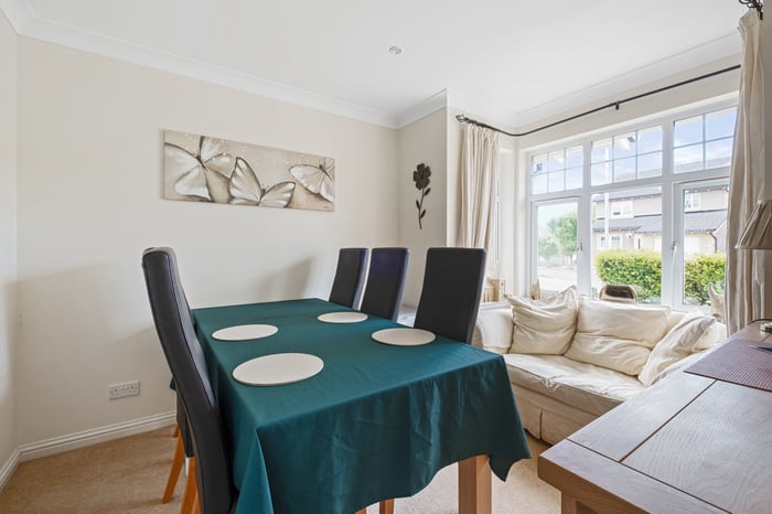 To the front, a tastefully finished dining room offers a formal space for entertaining, while an additional family room provides flexible lounge or playroom options. The well-appointed kitchen, located at the rear, is fitted with modern units, stone-effect worktops, a matching splashback, an integrated dishwasher, and ample space for freestanding appliances.