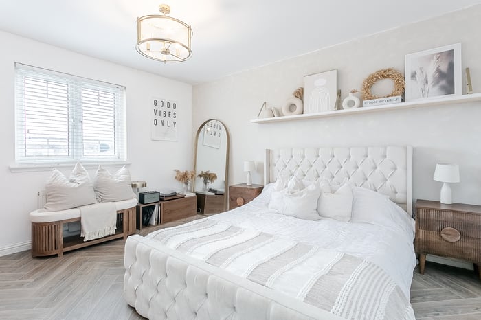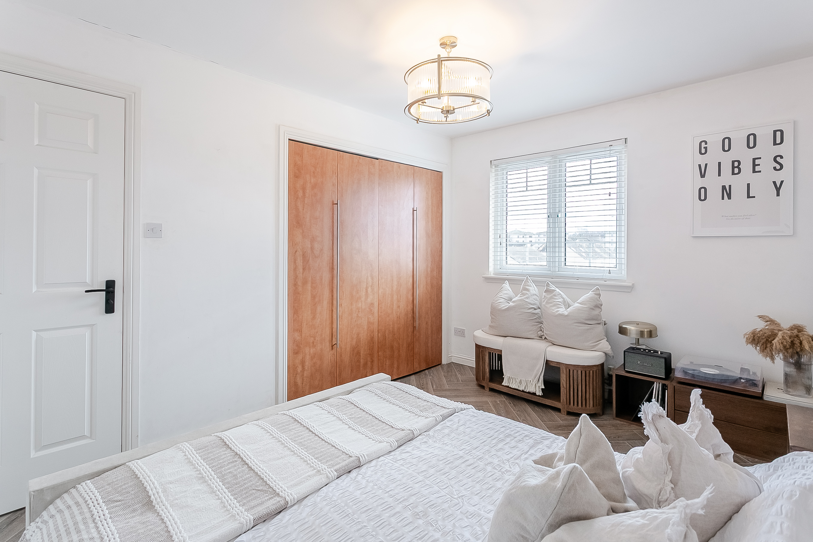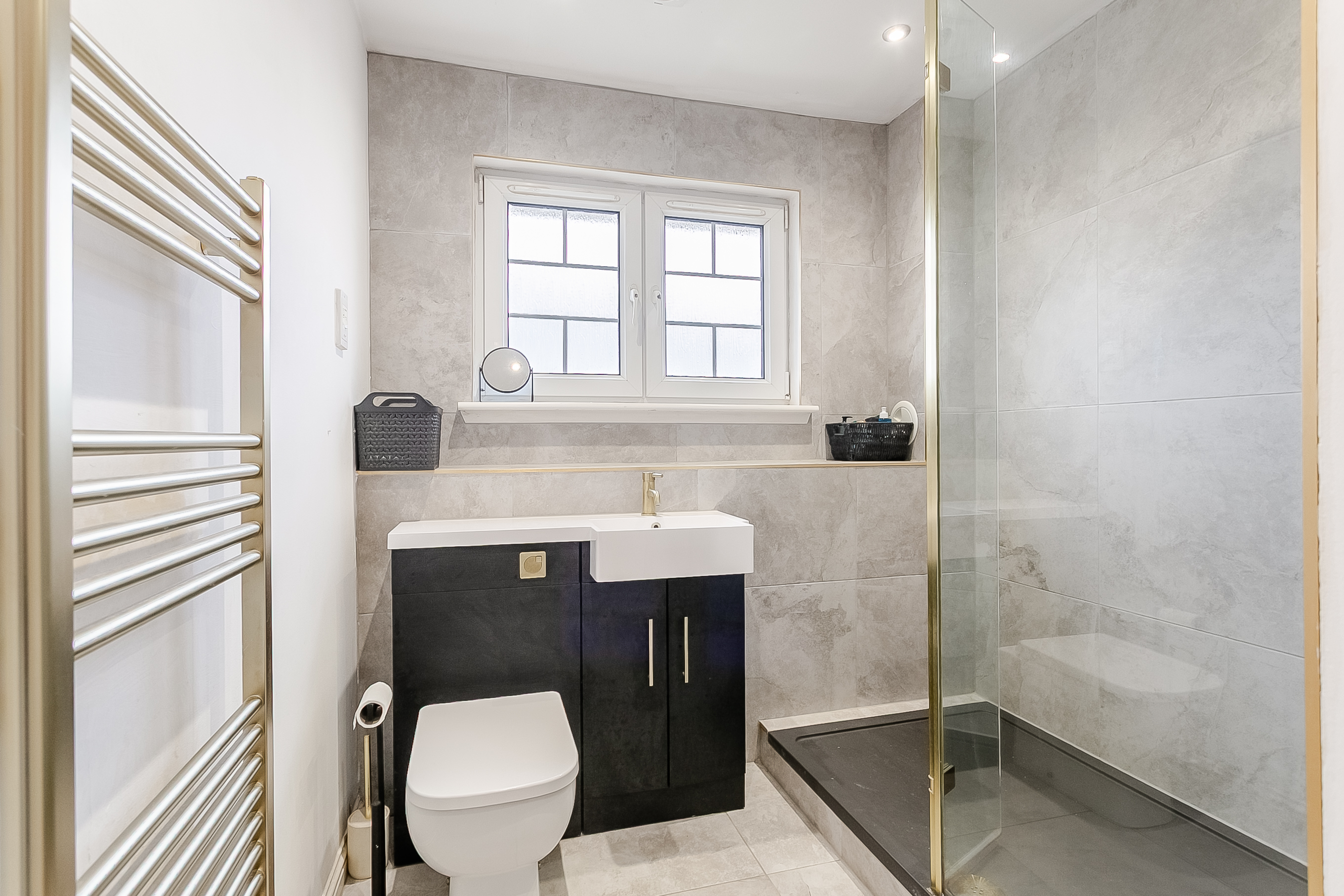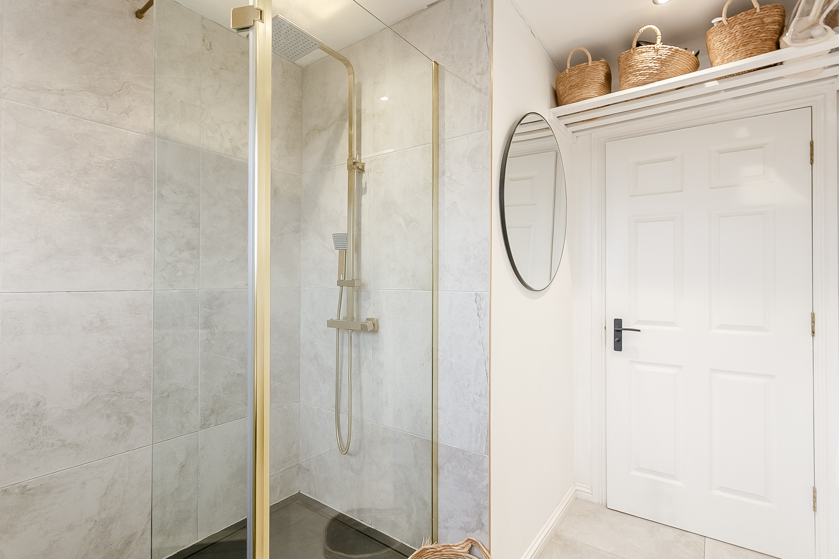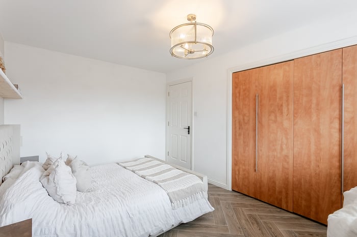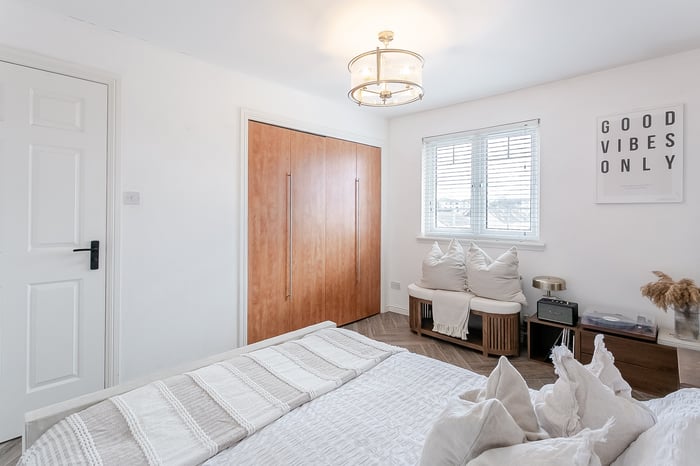Also positioned to the rear, the spacious double bedroom benefits from a large built-in wardrobe, a central pendant light fitting and ample space for additional freestanding furniture. Completing the accommodation is a stylish front-facing shower room, fitted with a modern suite comprising a walk-in cubicle with rainfall mains shower, a ladder-style radiator, tiled flooring and splash walls, and a convenient shaver point.
