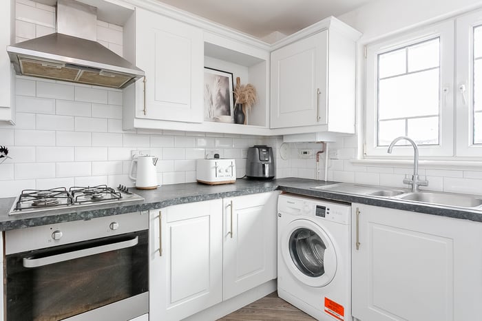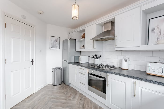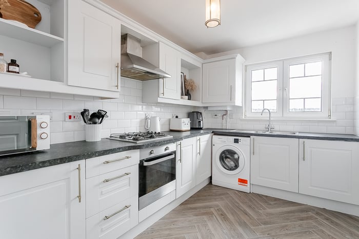 Features include a bay window flooding the room with natural light and offering superb views, a wall-mounted TV point, plain coving, spotlighting and a central light fitting. To the rear, the well-appointed kitchen is fitted with stone-effect worktops, a metro-tiled surround, a sink with a drainer, an integrated oven and gas hob with canopy extractor above, and a freestanding washing machine.