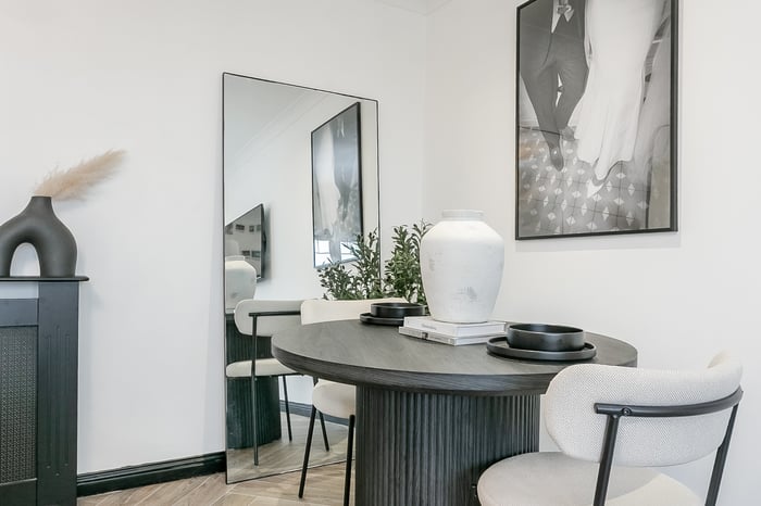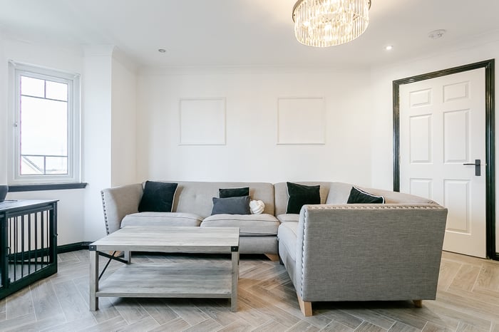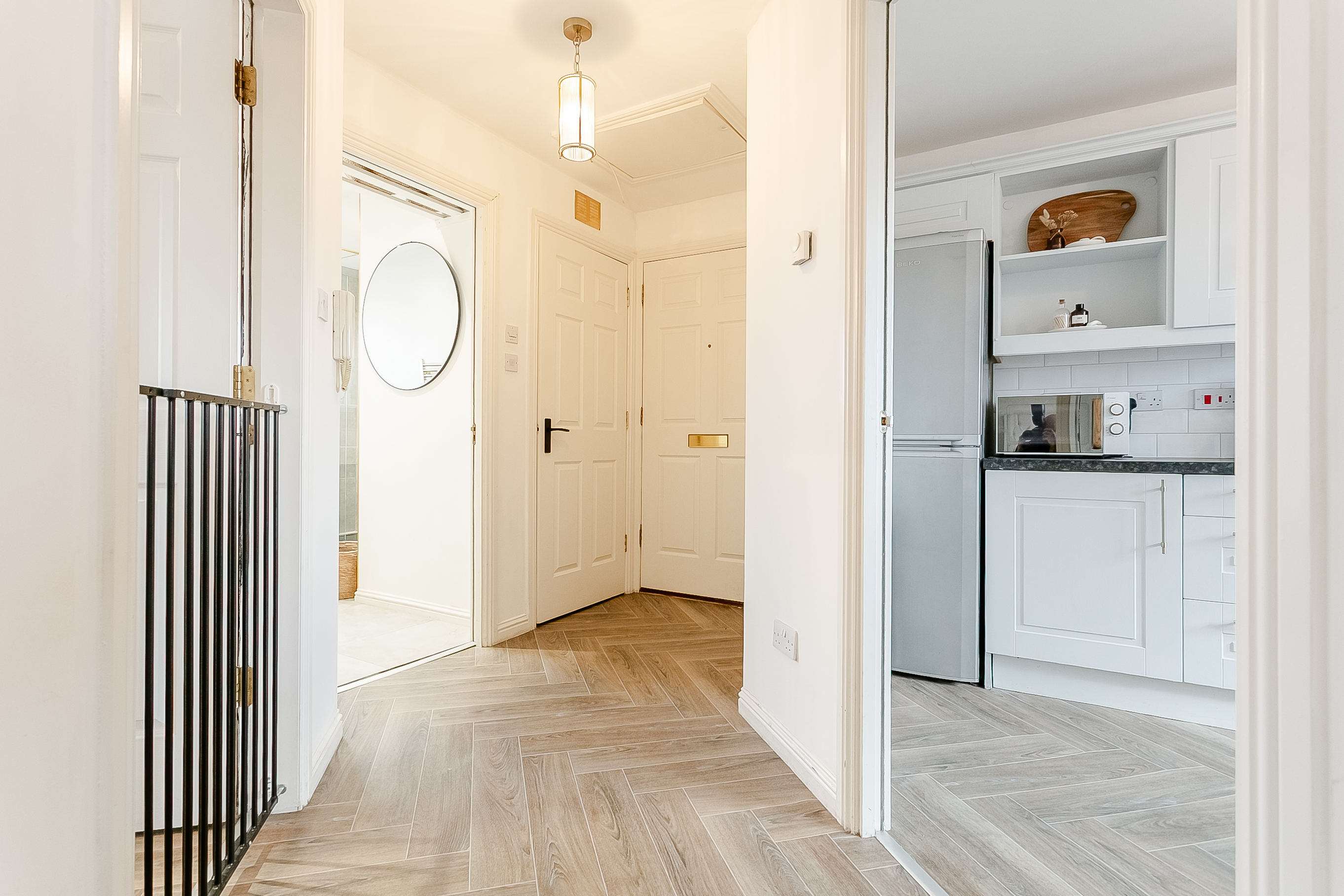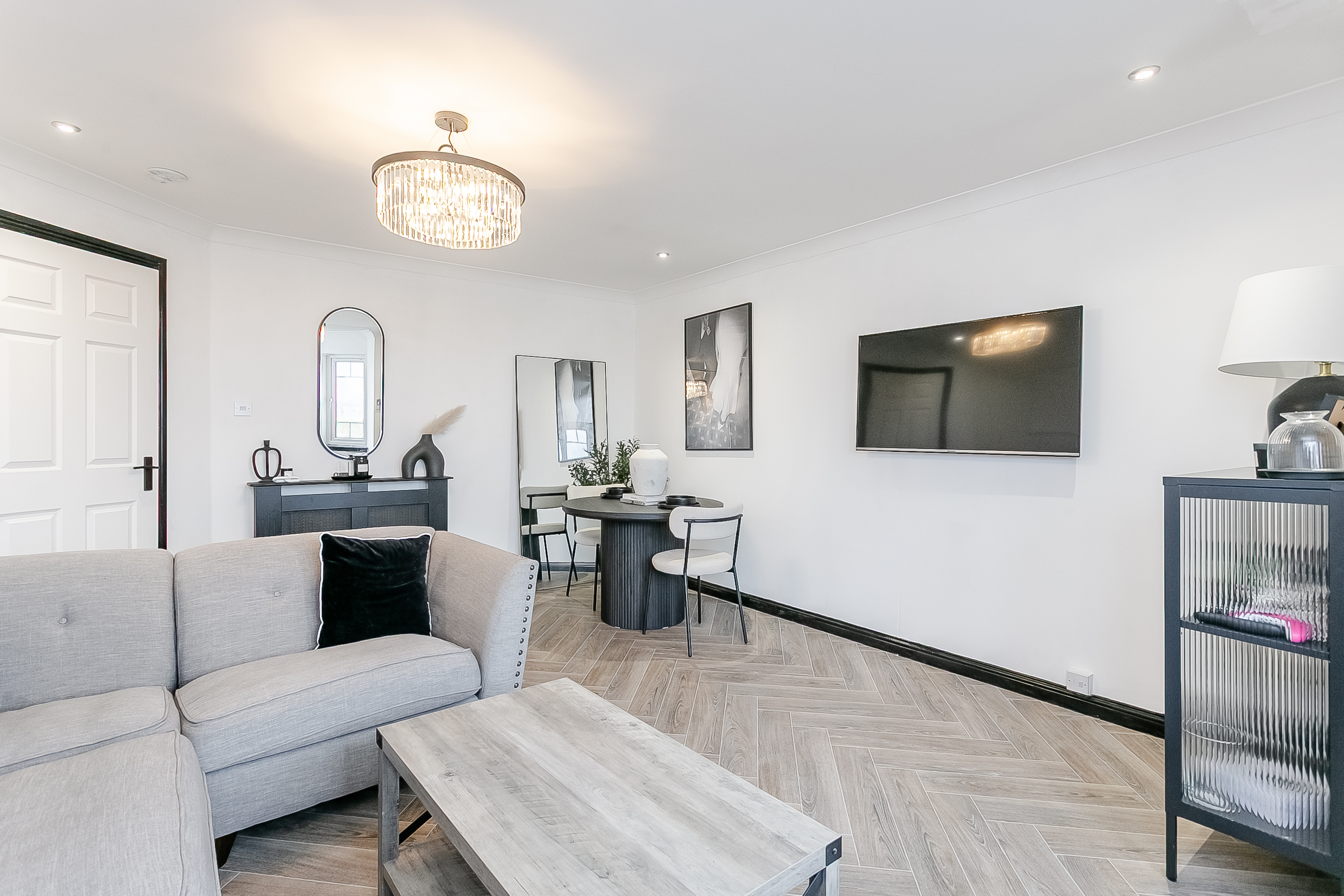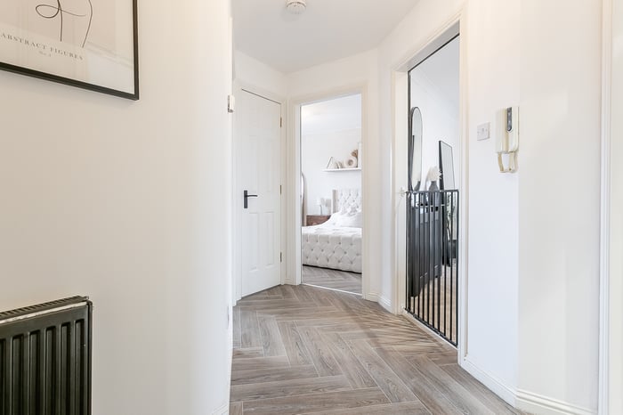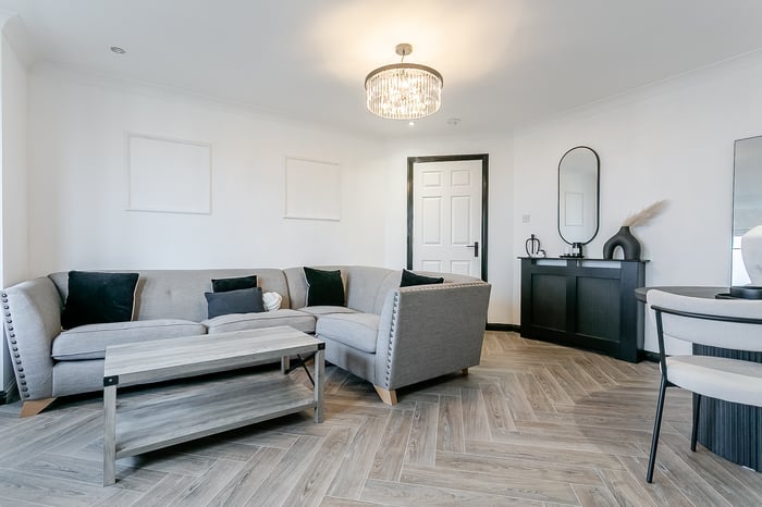 The accommodation is accessed via a welcoming entrance hall with a secure entry system, a built-in storage cupboard and contemporary herringbone-style laminate flooring, which continues seamlessly through the main living areas. To the front, a generously proportioned living and dining room is tastefully finished and offers excellent flexibility for both lounge and dining furniture.