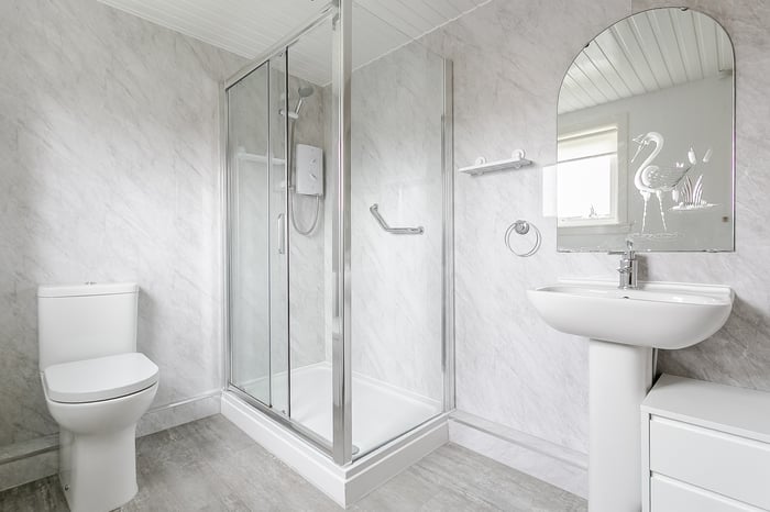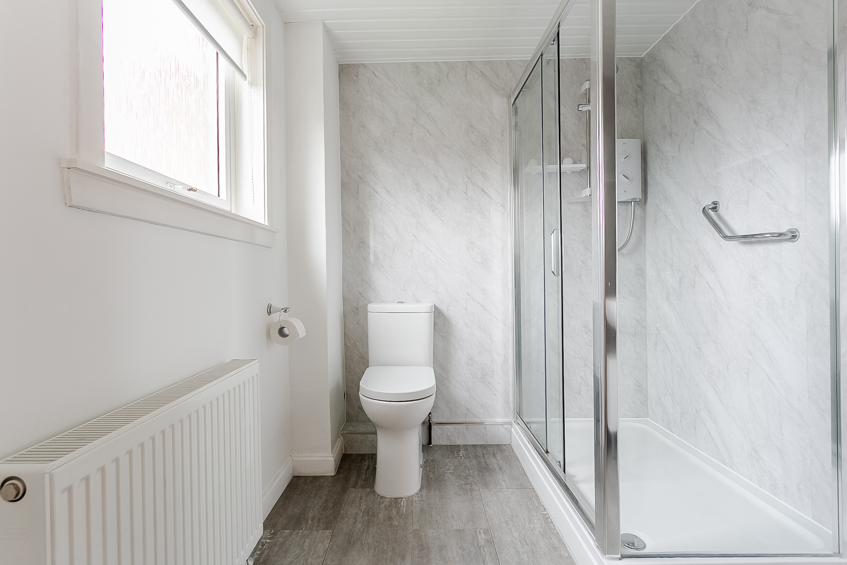 Completing the accommodation is a modern shower room fitted with a contemporary suite, panelled splash walls and wood-effect flooring.