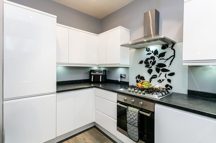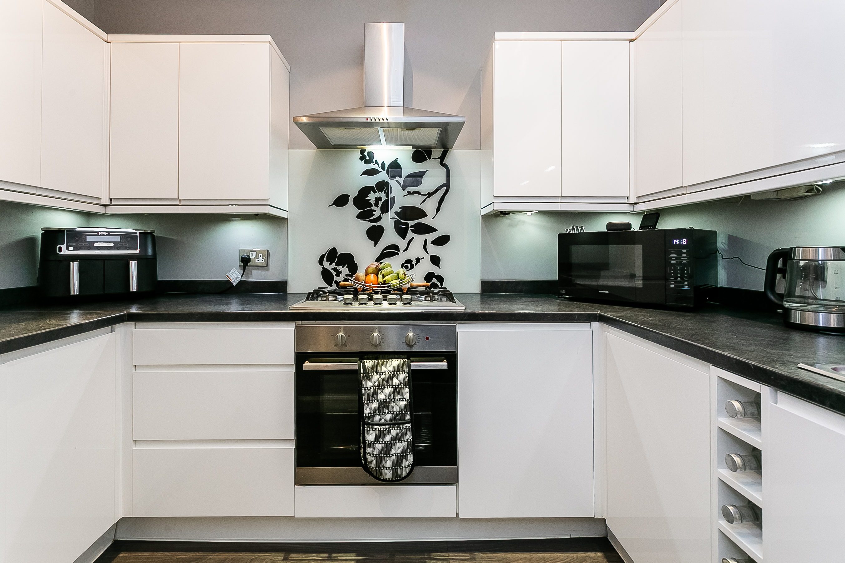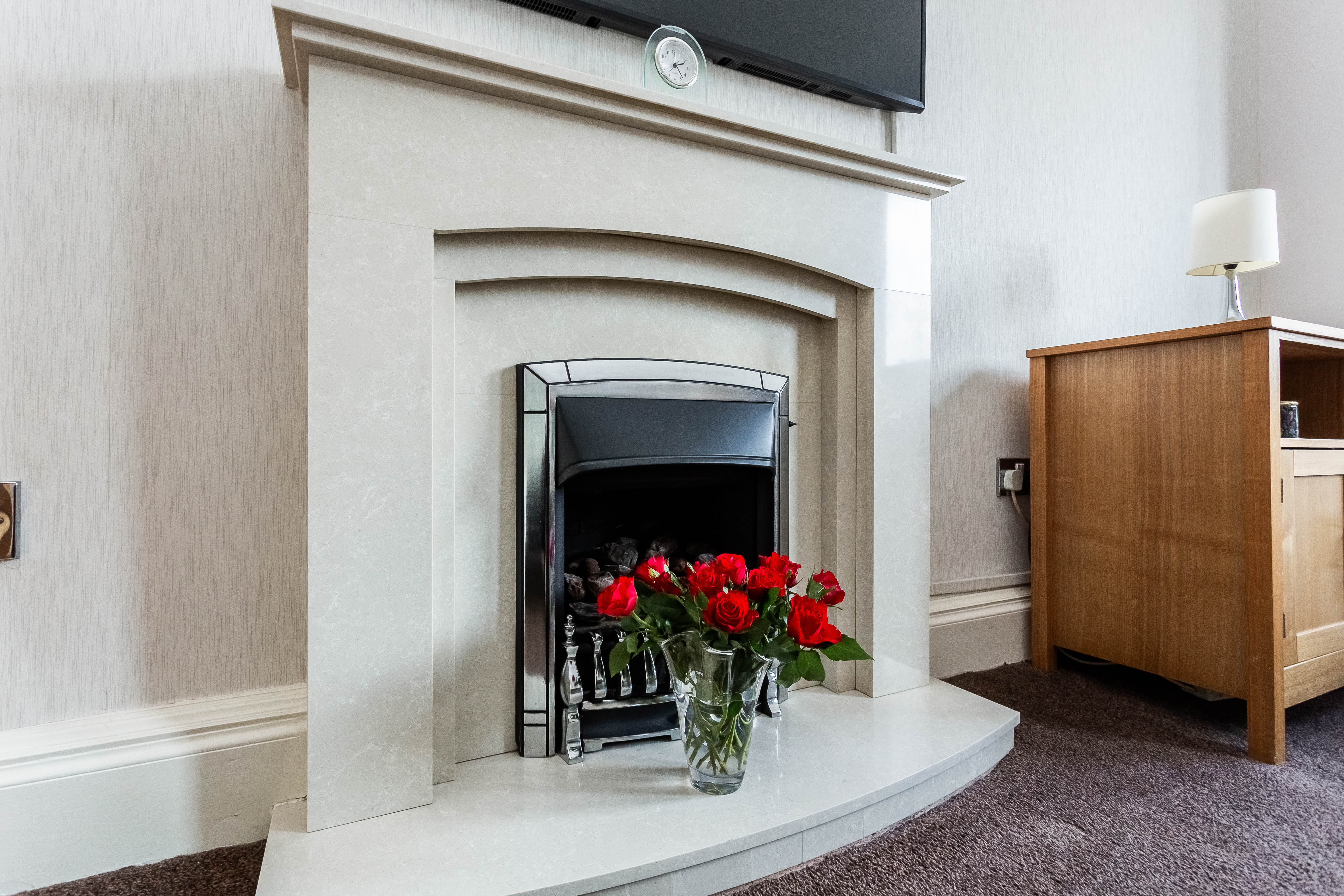 The living room is finished with carpeted flooring and features a wall-mounted TV point, a charming fireplace, and an attractive bay window that fills the space with natural light, making it perfect for relaxing or entertaining guests. The kitchen has been thoughtfully finished with contemporary flooring, granite-effect countertops with matching upstands, a stainless steel sink with drainer, an integrated oven, and a five-ring gas hob with canopy above, as well as space for a washing machine, dishwasher, and fridge/freezer.