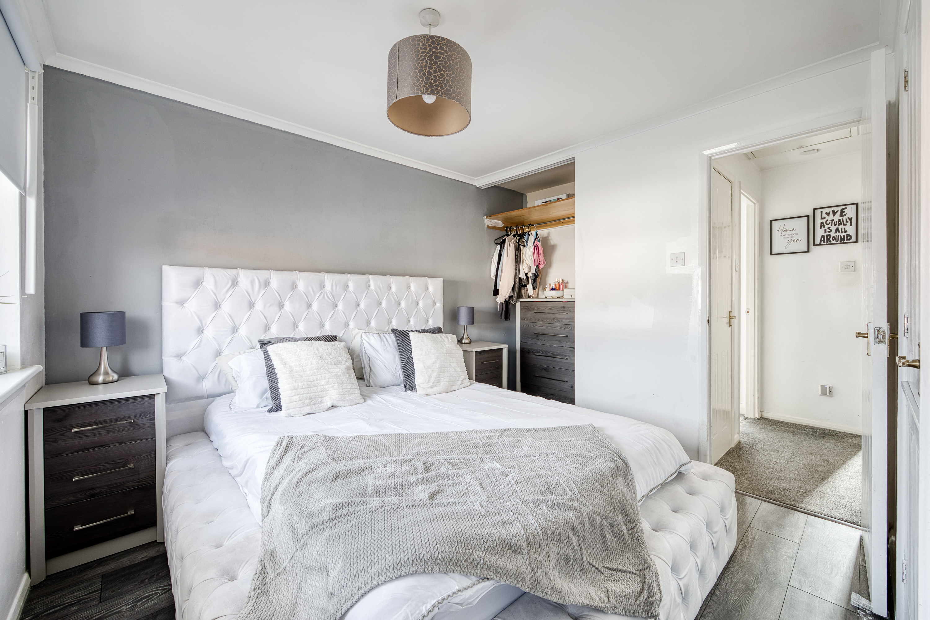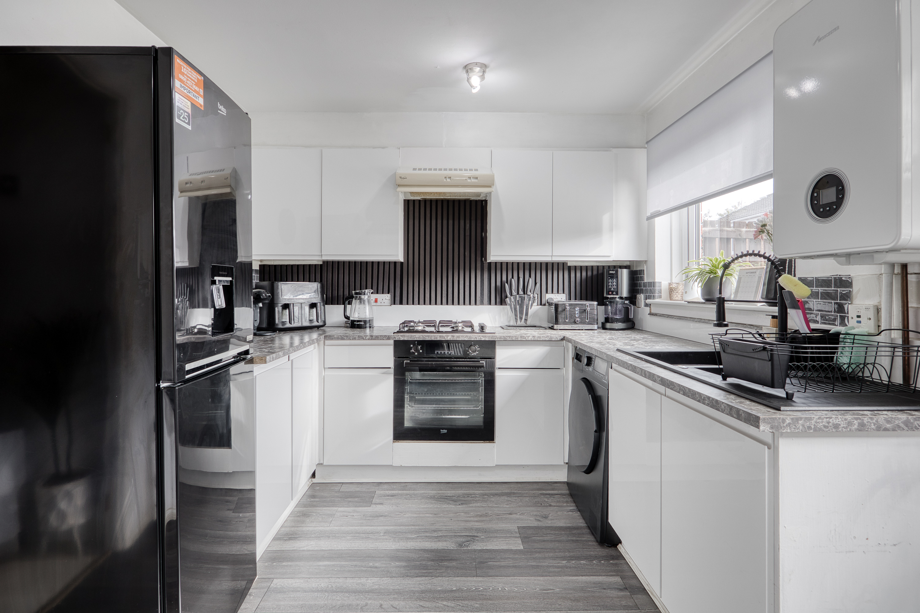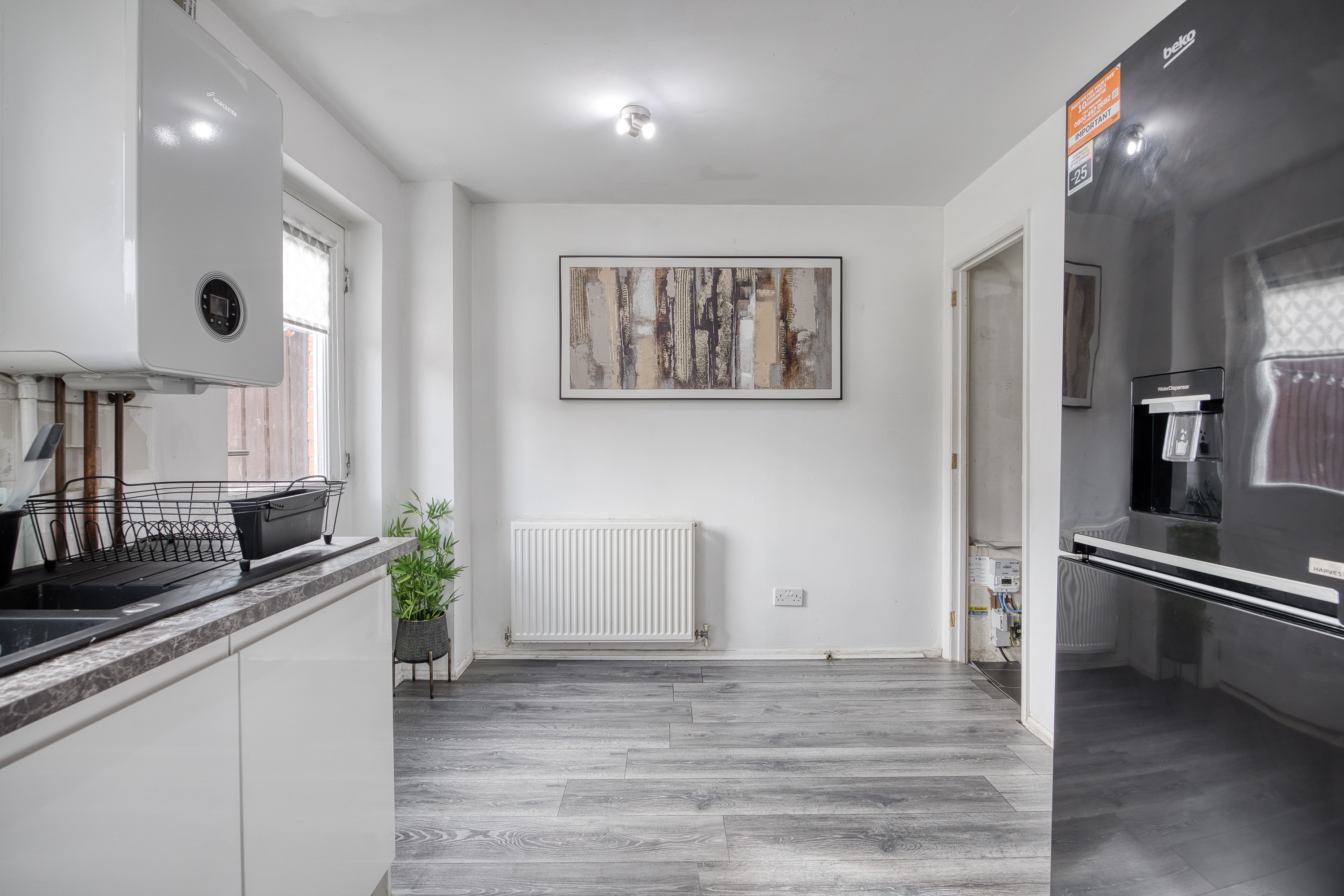The kitchen and dining area are finished with modern flooring and granite-effect worktops, complemented by a stylish splashback, stainless steel sink with drainer, integrated oven with gas hob and canopy, plus space for an additional appliance, while also opening directly onto the private garden. Upstairs, carpeted stairs lead to two well-presented bedrooms, both finished in light tones, with bedroom one further enhanced by wood-effect flooring and two built-in cupboards for excellent storage.