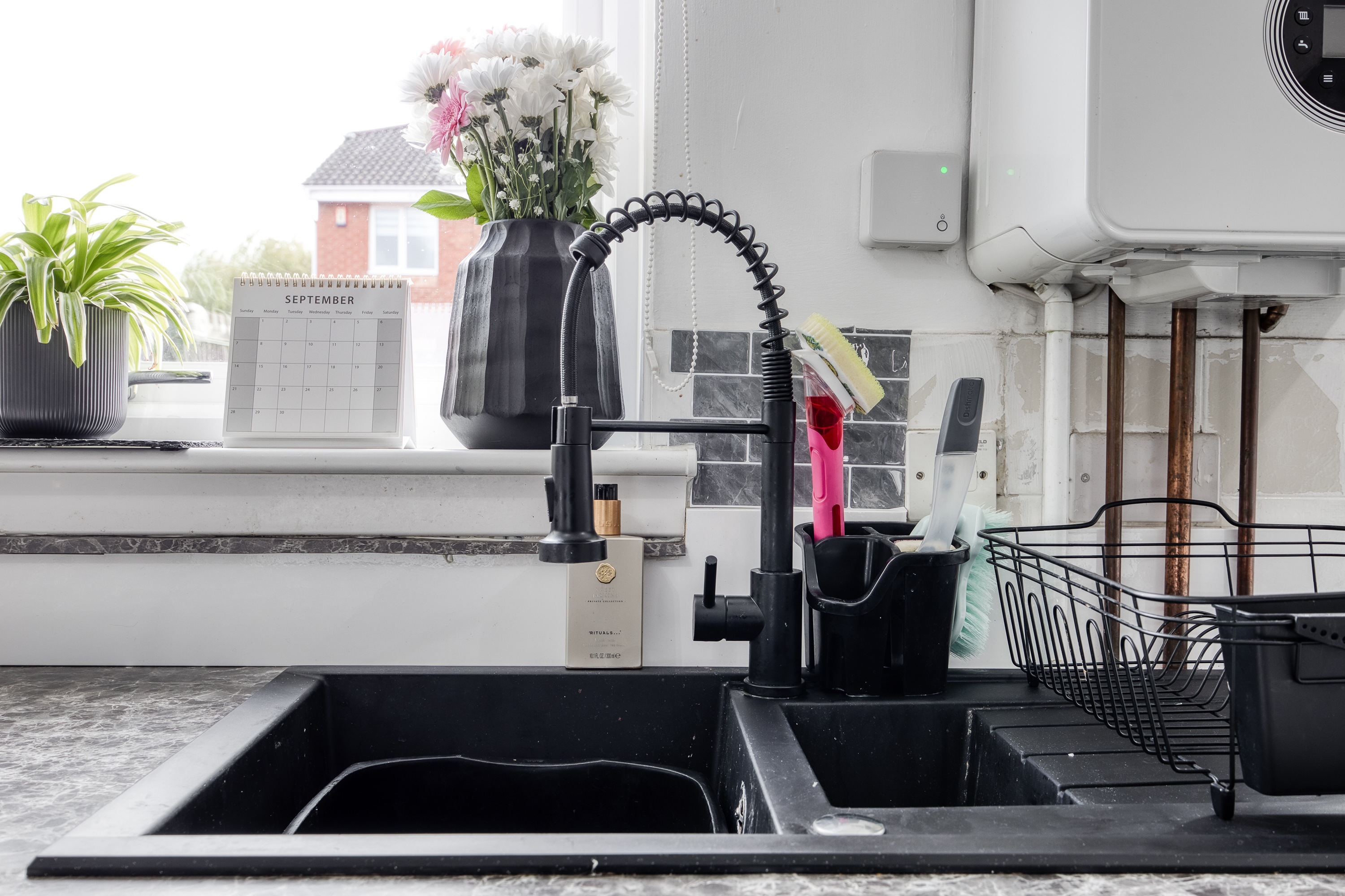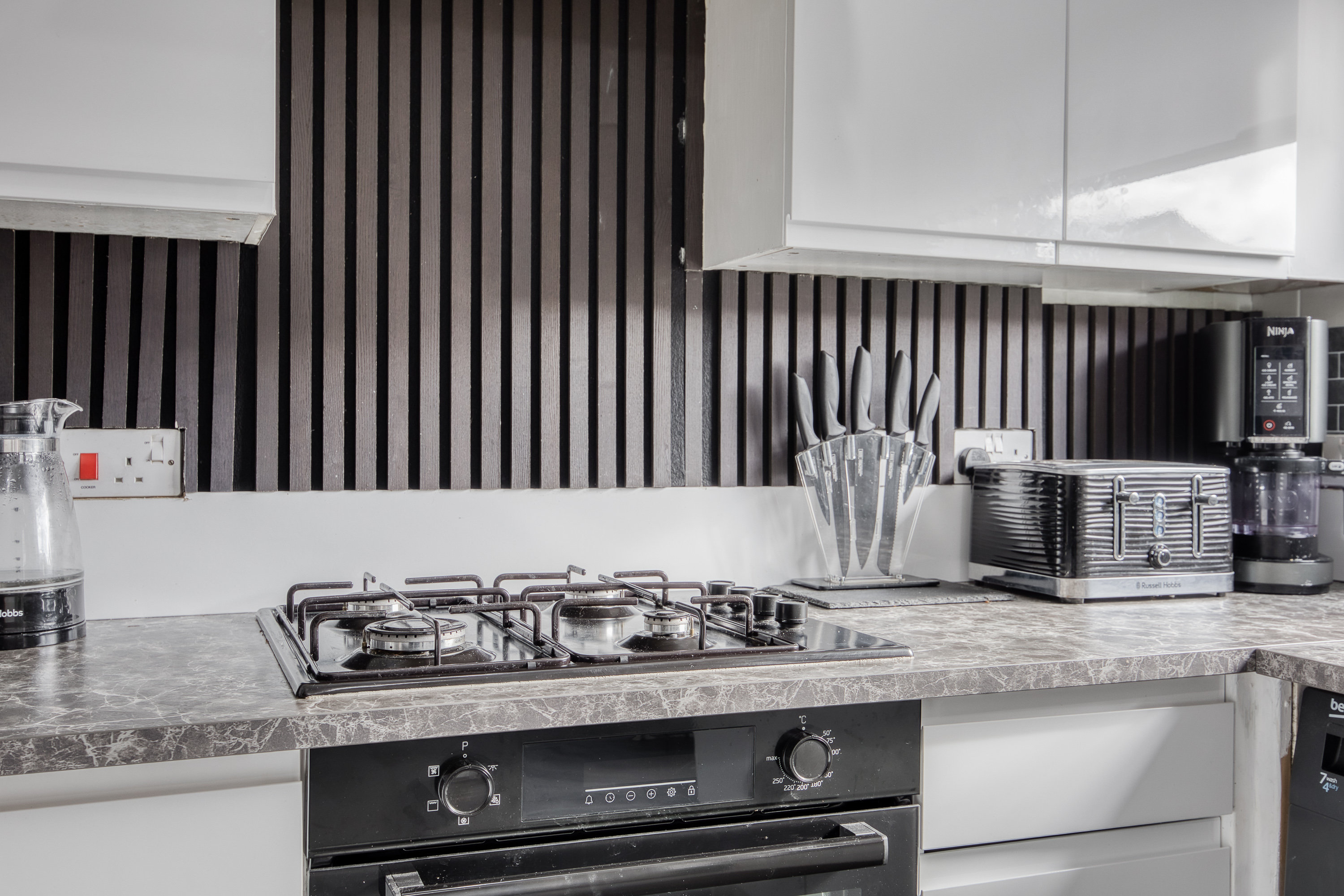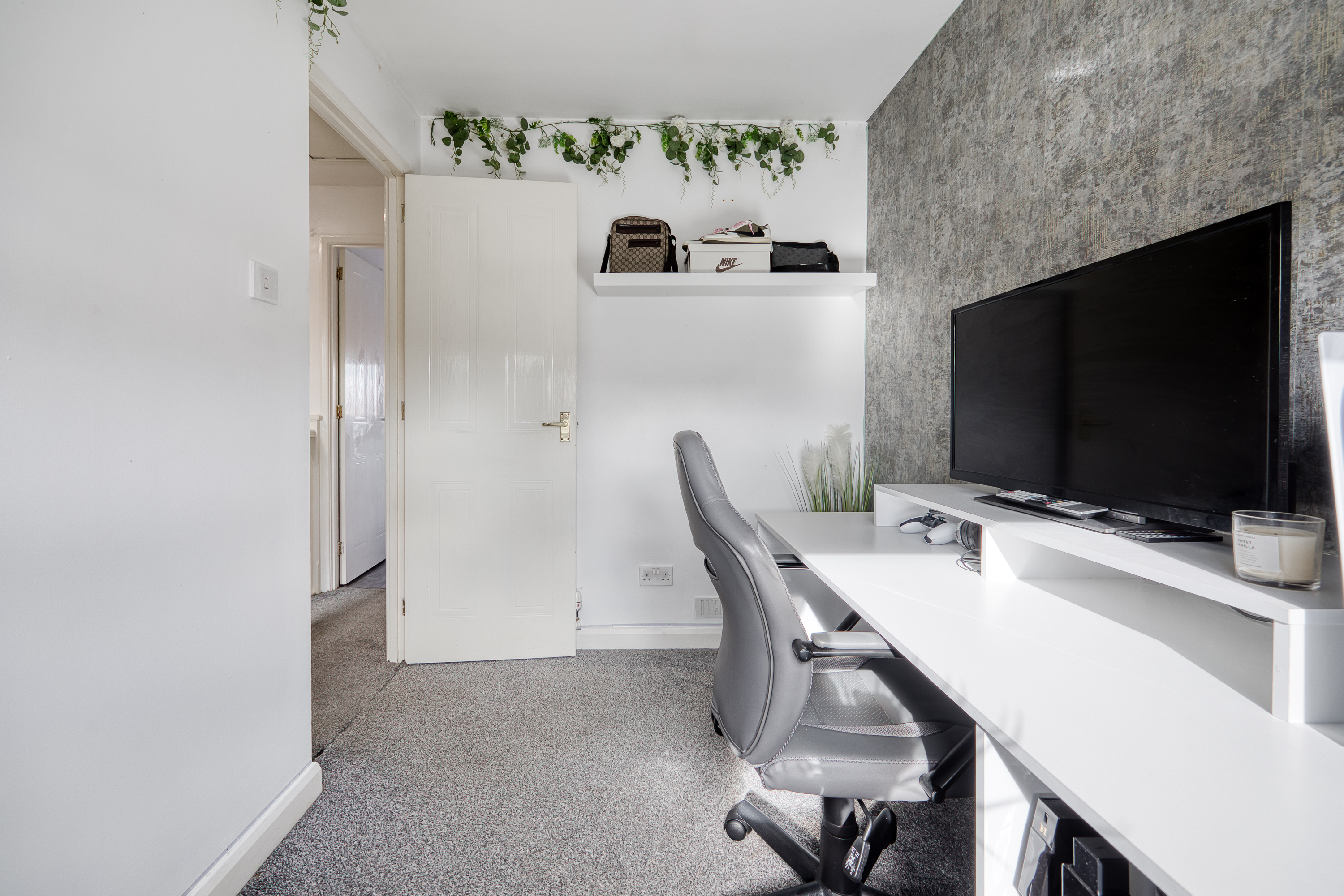 The kitchen and dining area are finished with modern flooring and granite-effect worktops, complemented by a stylish splashback, stainless steel sink with drainer, integrated oven with gas hob and canopy, plus space for an additional appliance, while also opening directly onto the private garden. Upstairs, carpeted stairs lead to two well-presented bedrooms, both finished in light tones, with bedroom one further enhanced by wood-effect flooring and two built-in cupboards for excellent storage.