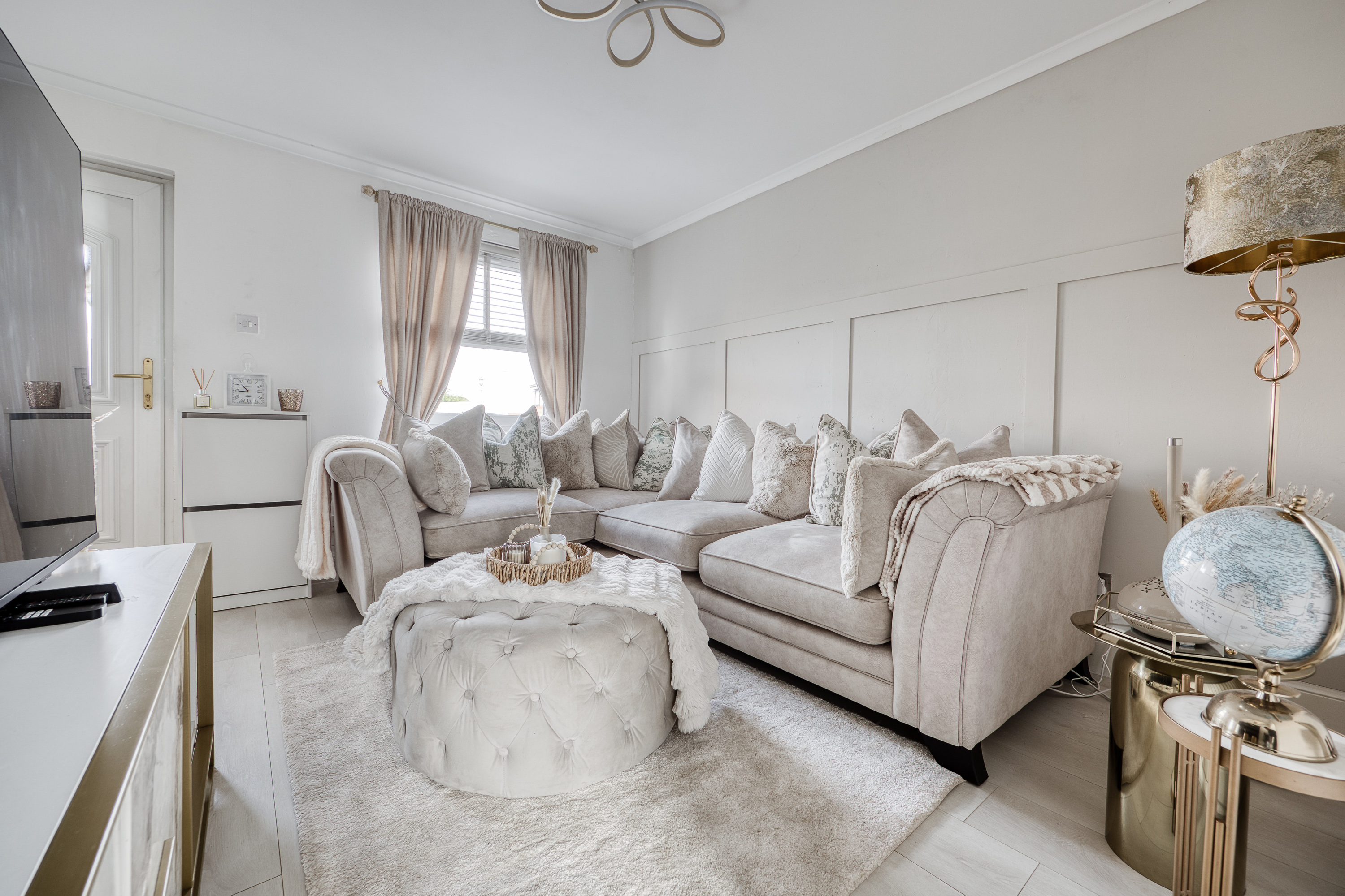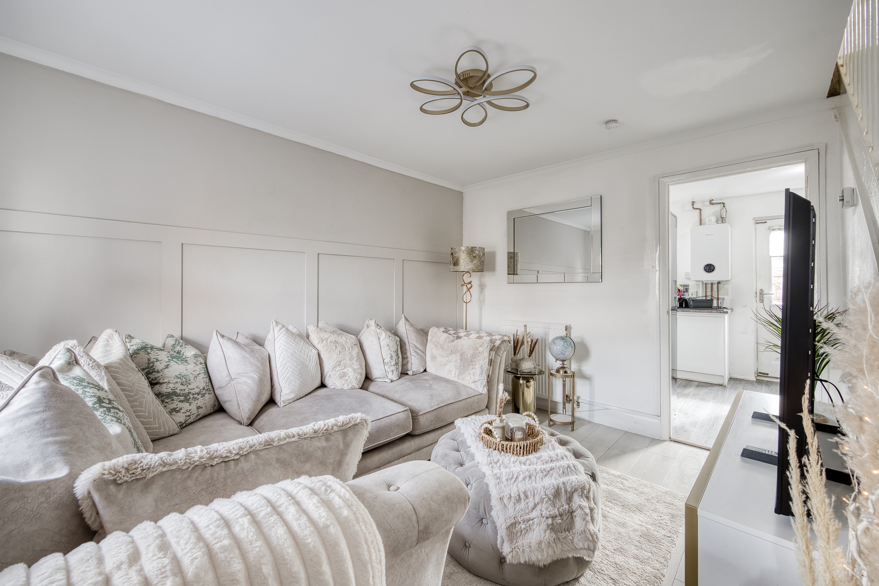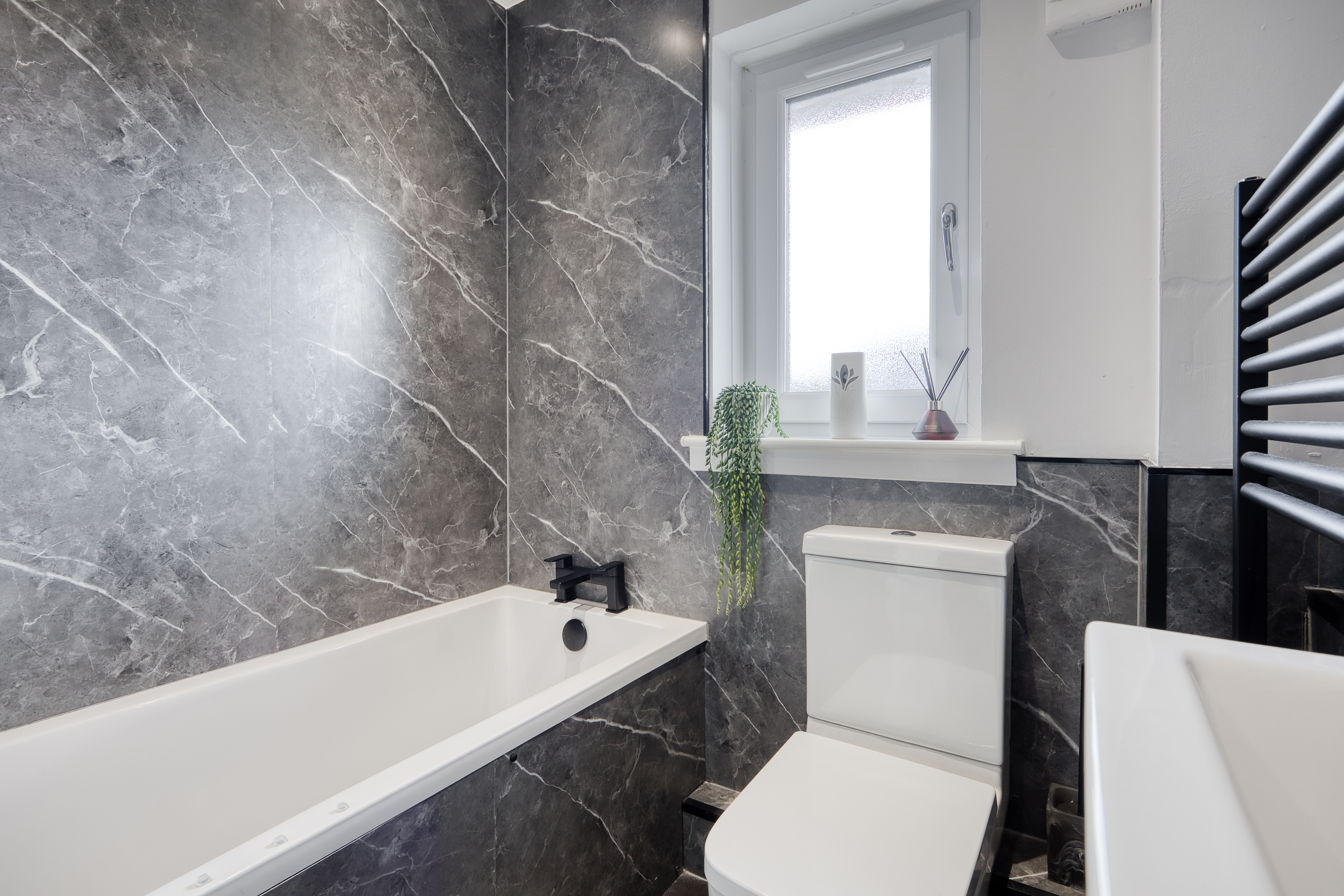 Completing the home is a family bathroom, fitted with a three-piece suite, tiled-effect flooring, panelled walls, a shower over the bath, and a sleek ladder-style radiator.