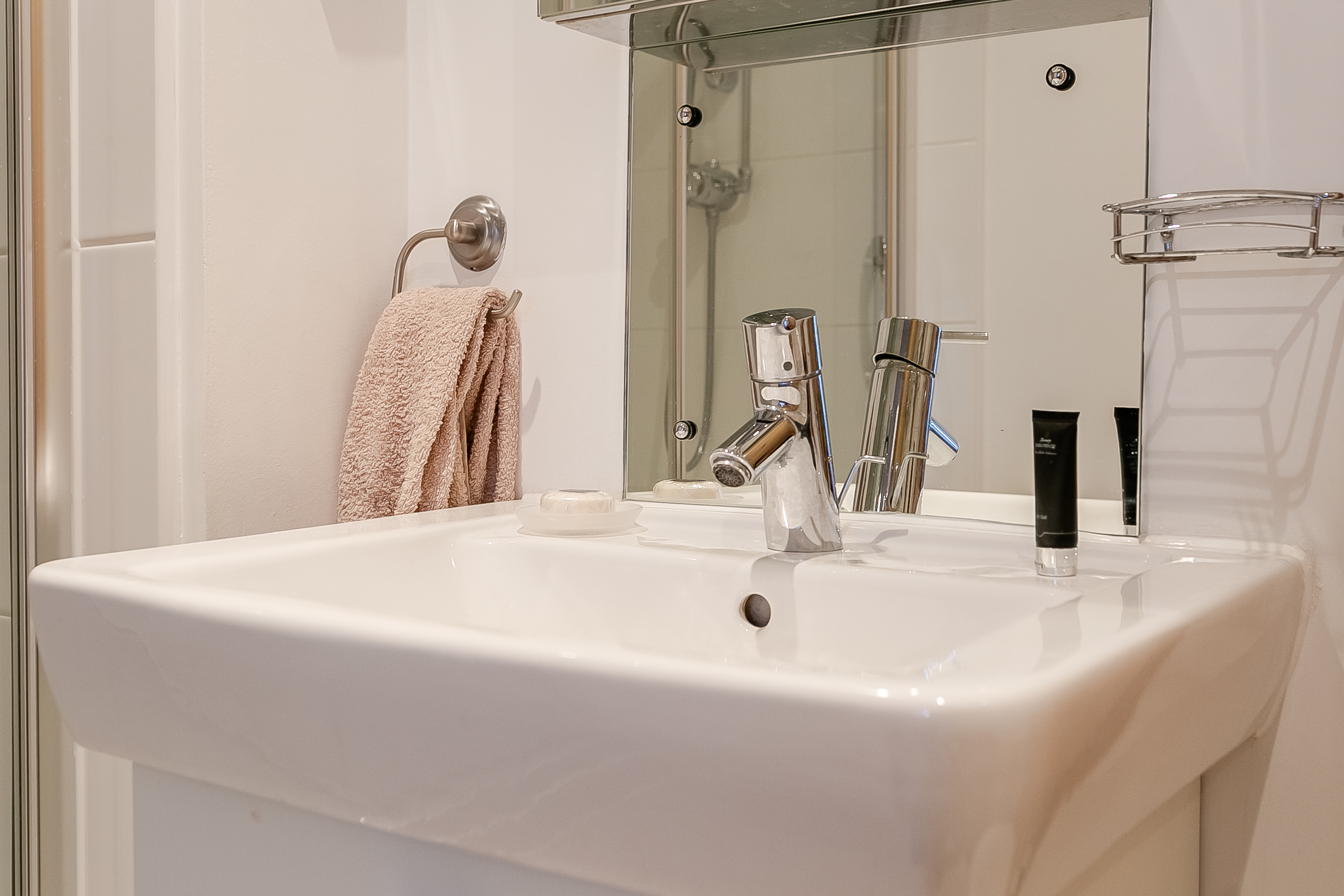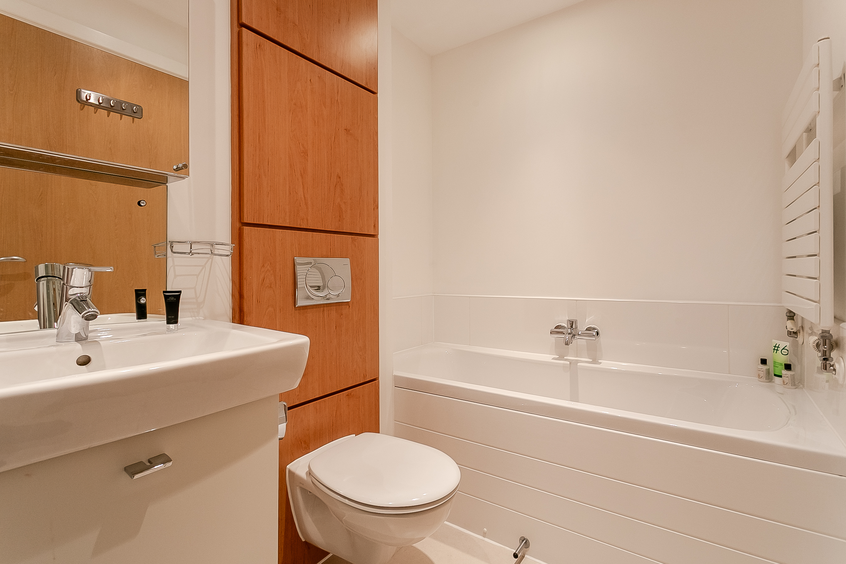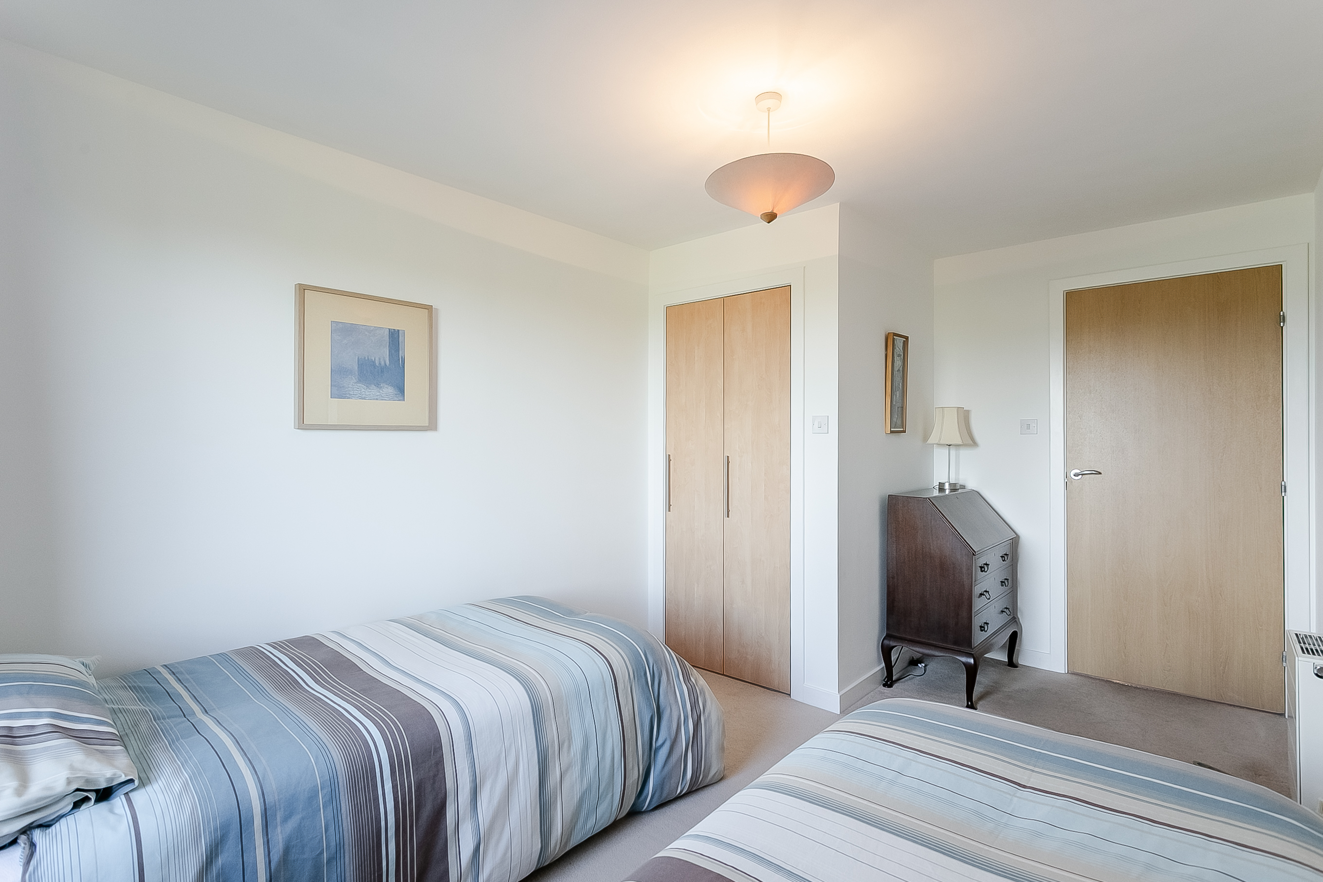 A central light fitting and a modern en-suite with bath, separate shower unit, mirrored wall cabinet, tiled flooring, and a contemporary column ladder-style radiator complete the space, making it both practical and comfortable. The second bedroom, also carpeted, benefits from its own built-in wardrobe and provides a flexible option for guests, family, or a home office.