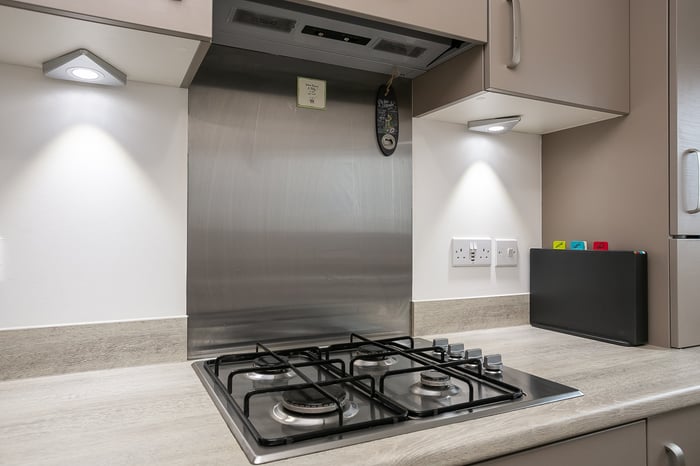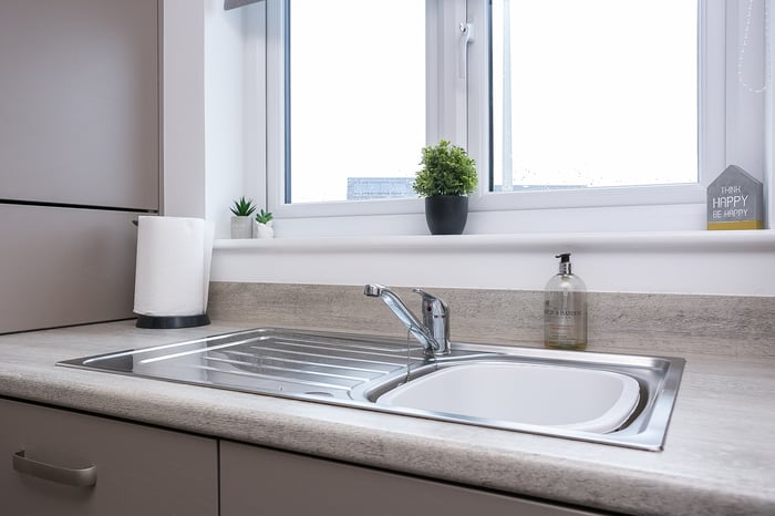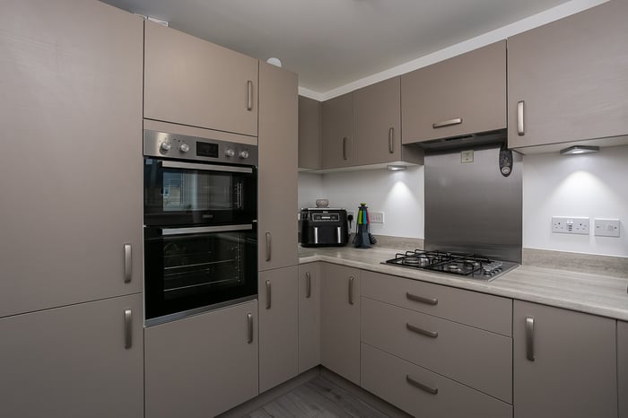 Set to the rear, a bright and tastefully finished living room offers space for dining and features carpeted flooring, a built-in cupboard, and patio doors leading to the southerly-west-facing garden. Set to the front, a stylish kitchen is fitted with modern units, wood effect worktops and matching upstands, and a sink with a drainer; with integrated appliances including an oven, a gas hob, a fridge/freezer, a dishwasher and a washing machine.