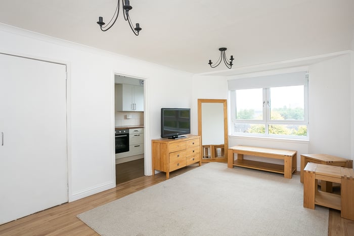 Beautifully presented, two-bedroom, third (top) floor apartment, set within a modern, factored, residential development, with an allocated garage. ith superb city skyline views, located in the popular Kinning Park area just south of Glasgow city centre. A welcoming entrance hall affords access throughout the majority of the property and features superb storage provision with two built-in cupboards. Enjoying leafy views, the front-facing living room features light decor, wood effect flooring and a spacious room size with ample space for dining furniture, as well as lounge furniture.
