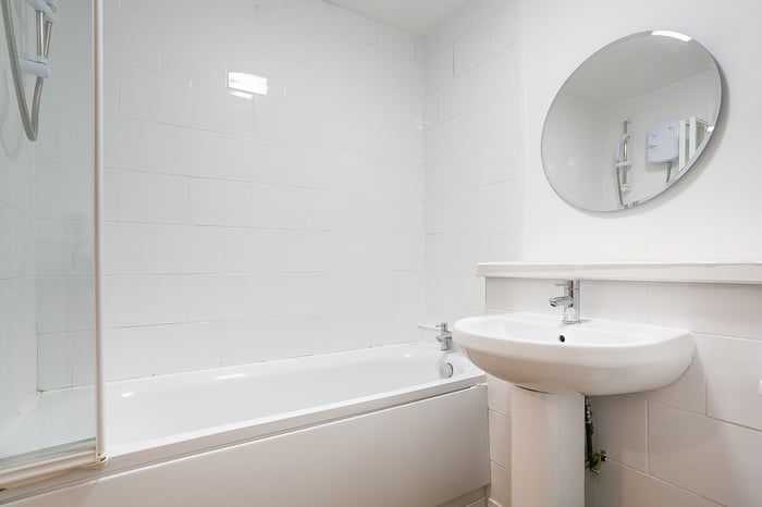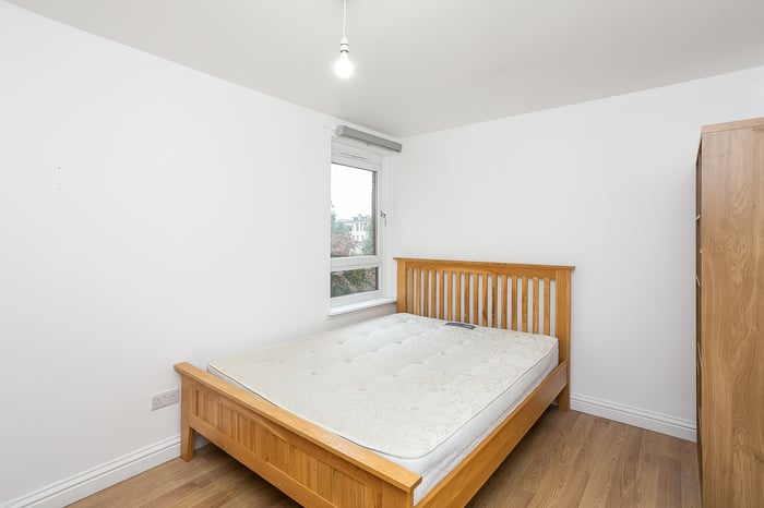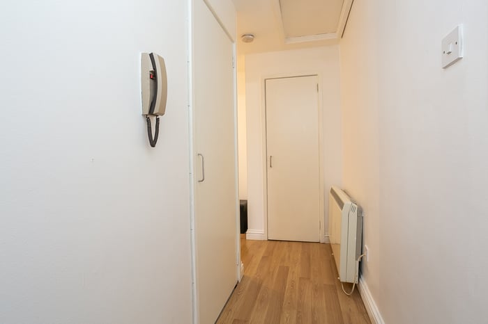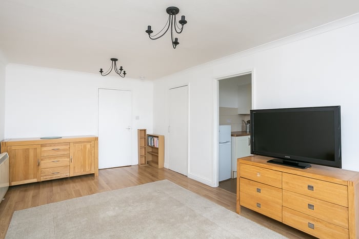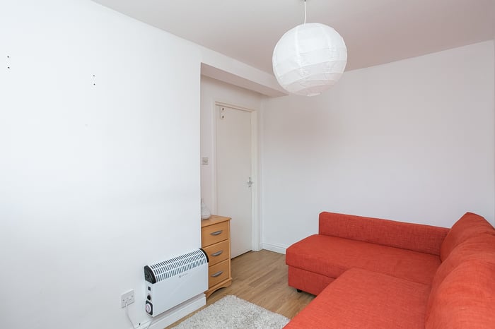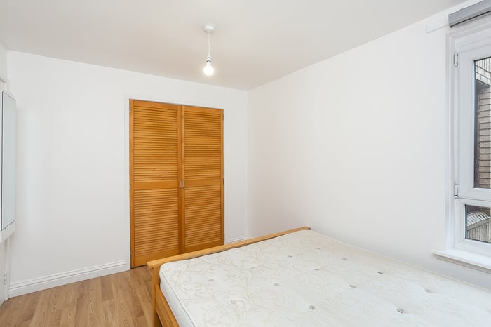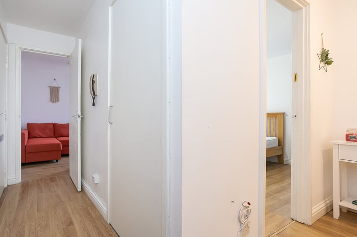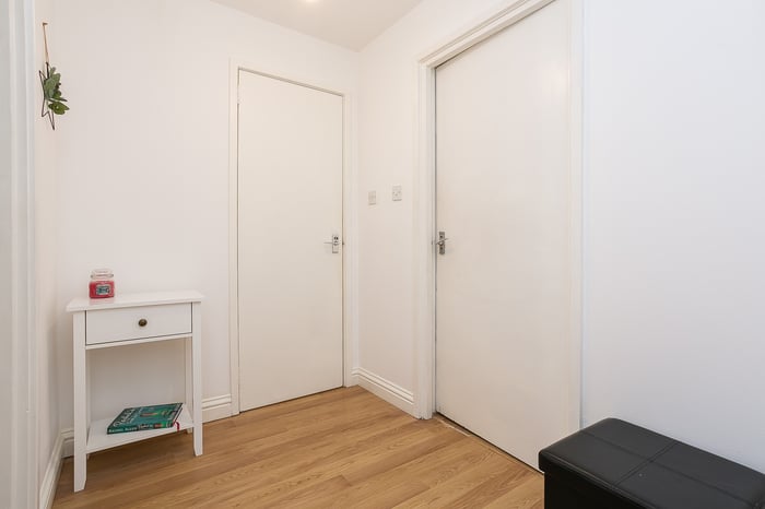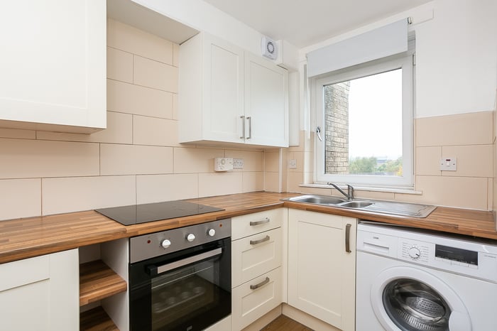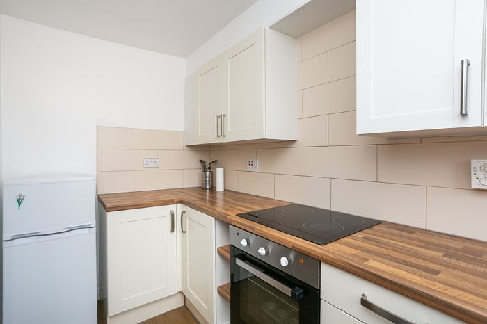 Set off the living room, the stylish kitchen is fitted with modern units, wood effect worktops, a tiled surround, and an integrated oven and electric hob. To the rear, two double bedrooms are similarly sized and well-finished, with light decor and wood effect flooring, with bedroom one also featuring a built-in wardrobe.
