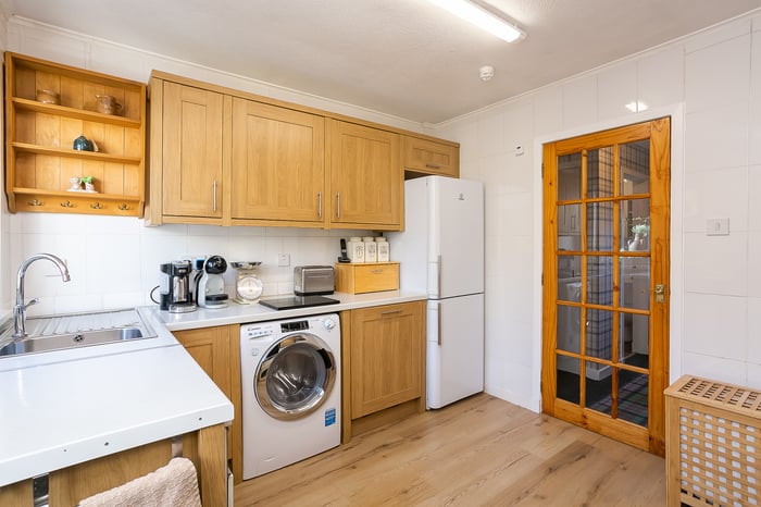 The generous conservatory offers a further flexible public room and has modern wood-effect flooring and a further patio door to the rear garden. A bright kitchen also has access to the rear garden, as well as modern wood-effect flooring and tiled walls; whilst fitted units and worktops include a stainless steel sink with drainer and an integrated dishwasher.