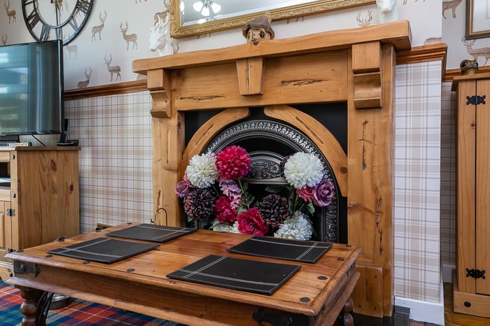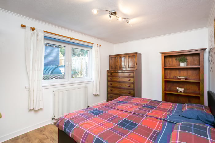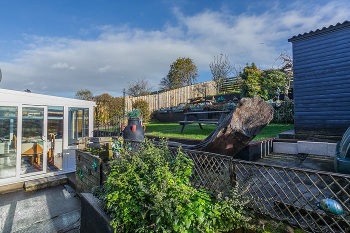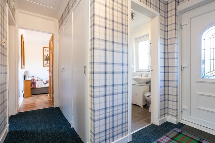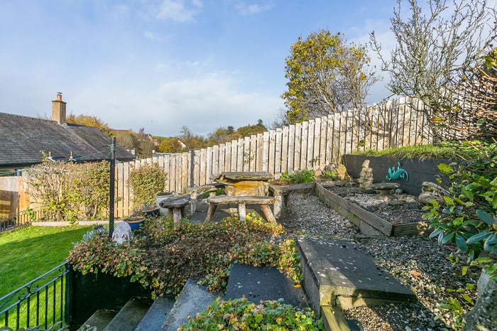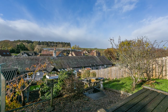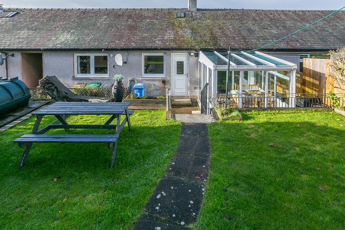 Beautifully presented and spacious, two-bedroom, mid-terrace cottage, with highly-maintained gardens. With an idyllic rural location, set adjacent to the Ceres Burn and bordered by rural land, in the village of Pitscottie, Fife. A carpeted hallway gives access to the majority of the property, and features two built-in storage cupboards, plain coving and ample space for outerwear. A spacious lounge enjoys a dual-aspect offering plentiful natural light, and includes a feature fireplace with an impressive solid-wood surround, varnished hardwood flooring, a fitted carpet, dado rail, and a patio door to the conservatory.
