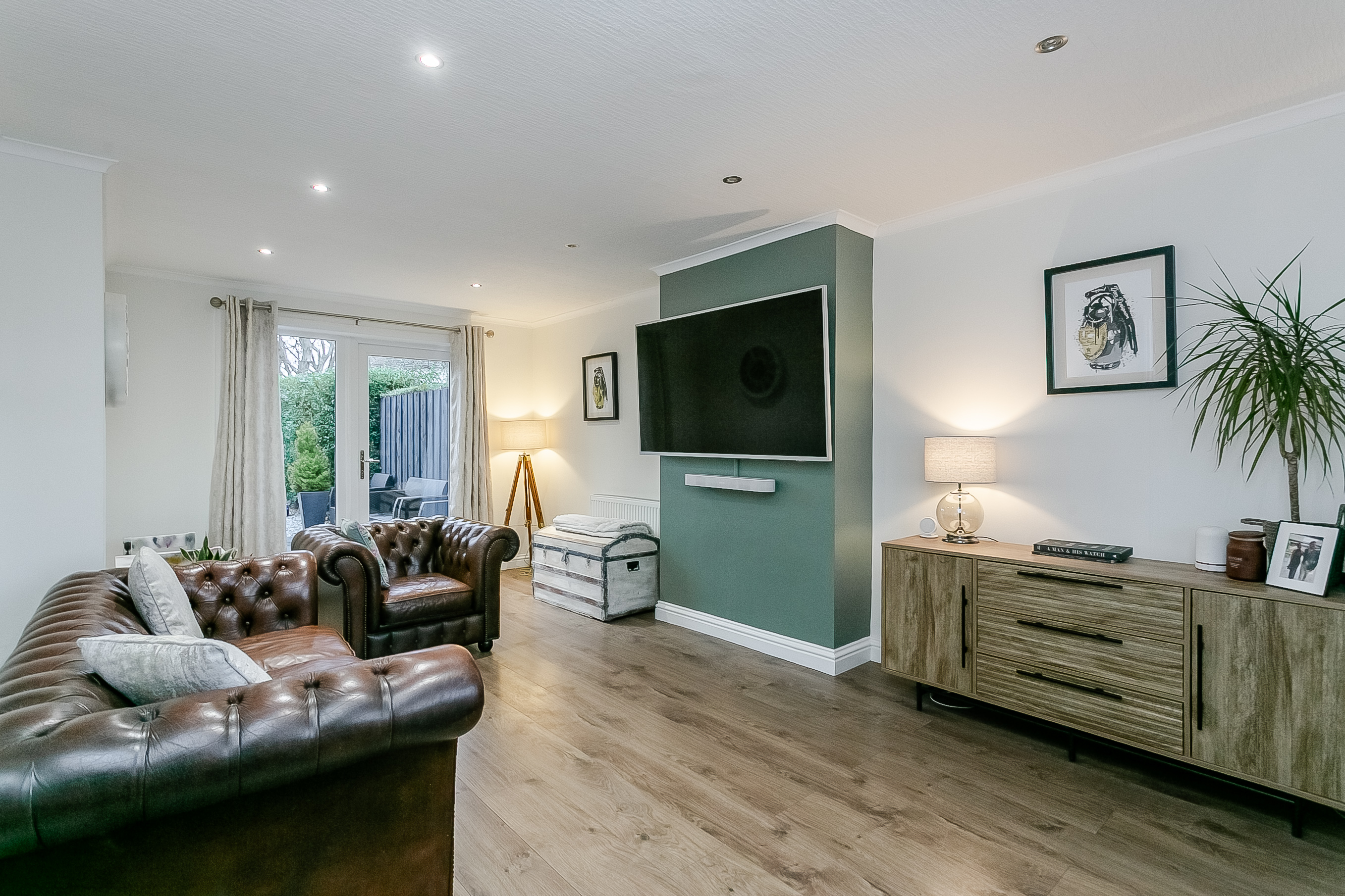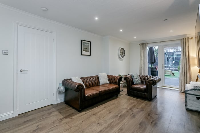 There is ample room for both comfortable seating and a dining area, making it ideal for everyday living and entertaining. A wall-mounted TV point adds convenience, while the patio doors allow natural light to flood the room and provide direct access to the rear garden, seamlessly blending indoor and outdoor living.