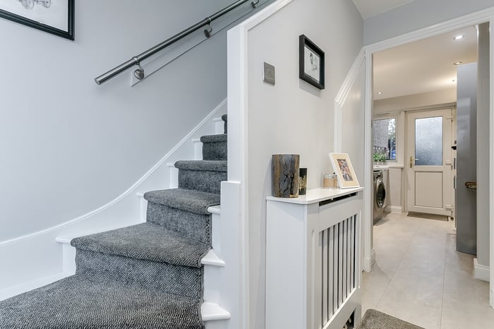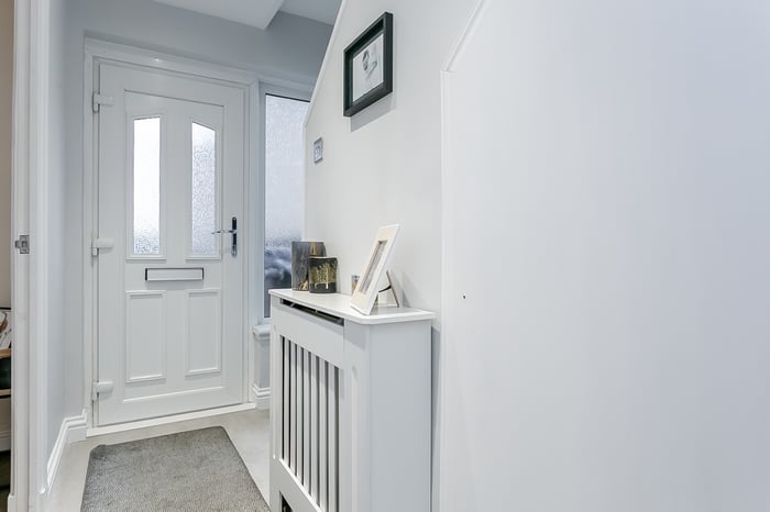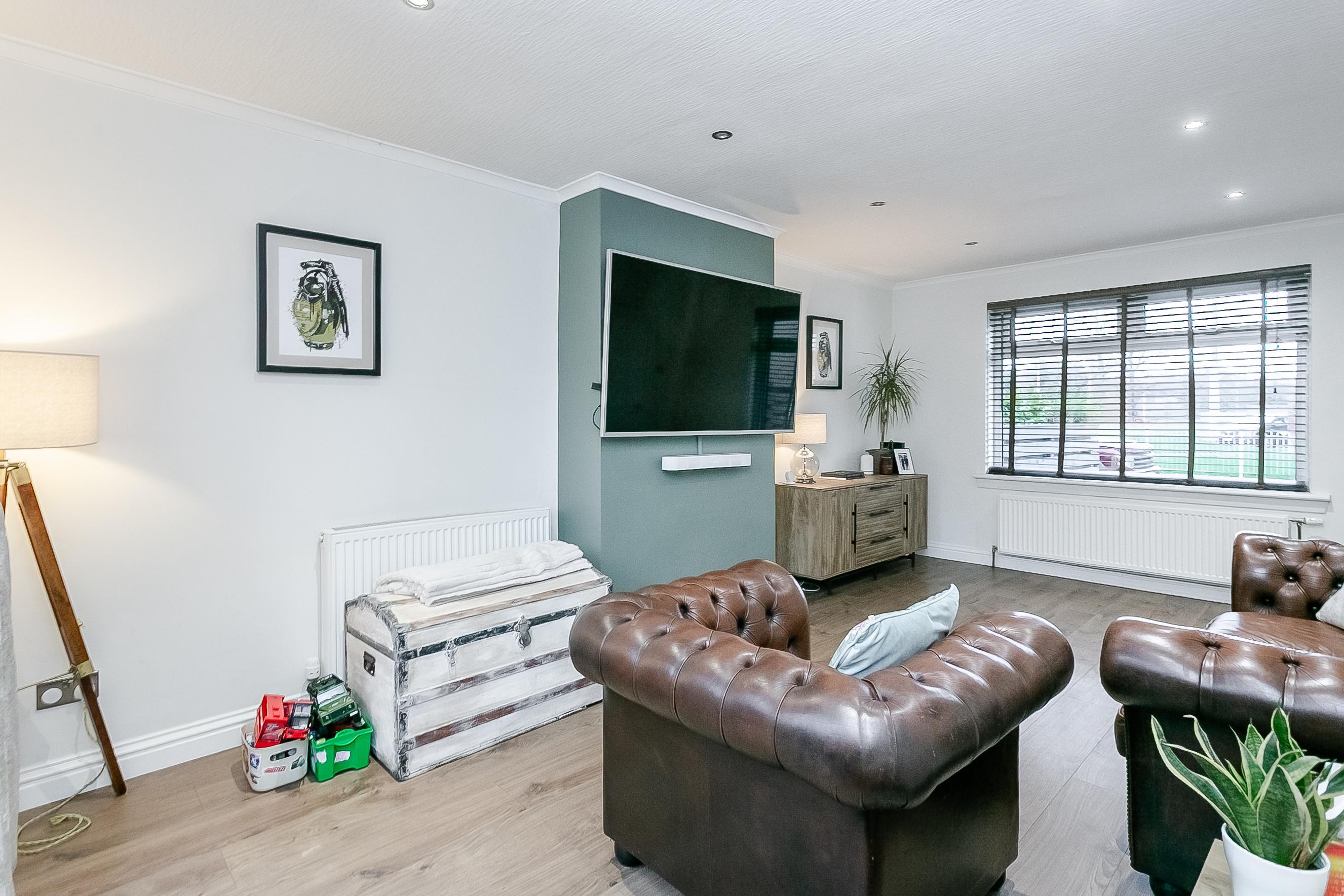 The welcoming entrance hall provides access to all ground-floor rooms, creating a practical and well-connected layout. The spacious living and dining room is a bright and inviting space, enhanced by wood-effect flooring and contemporary spotlighting.