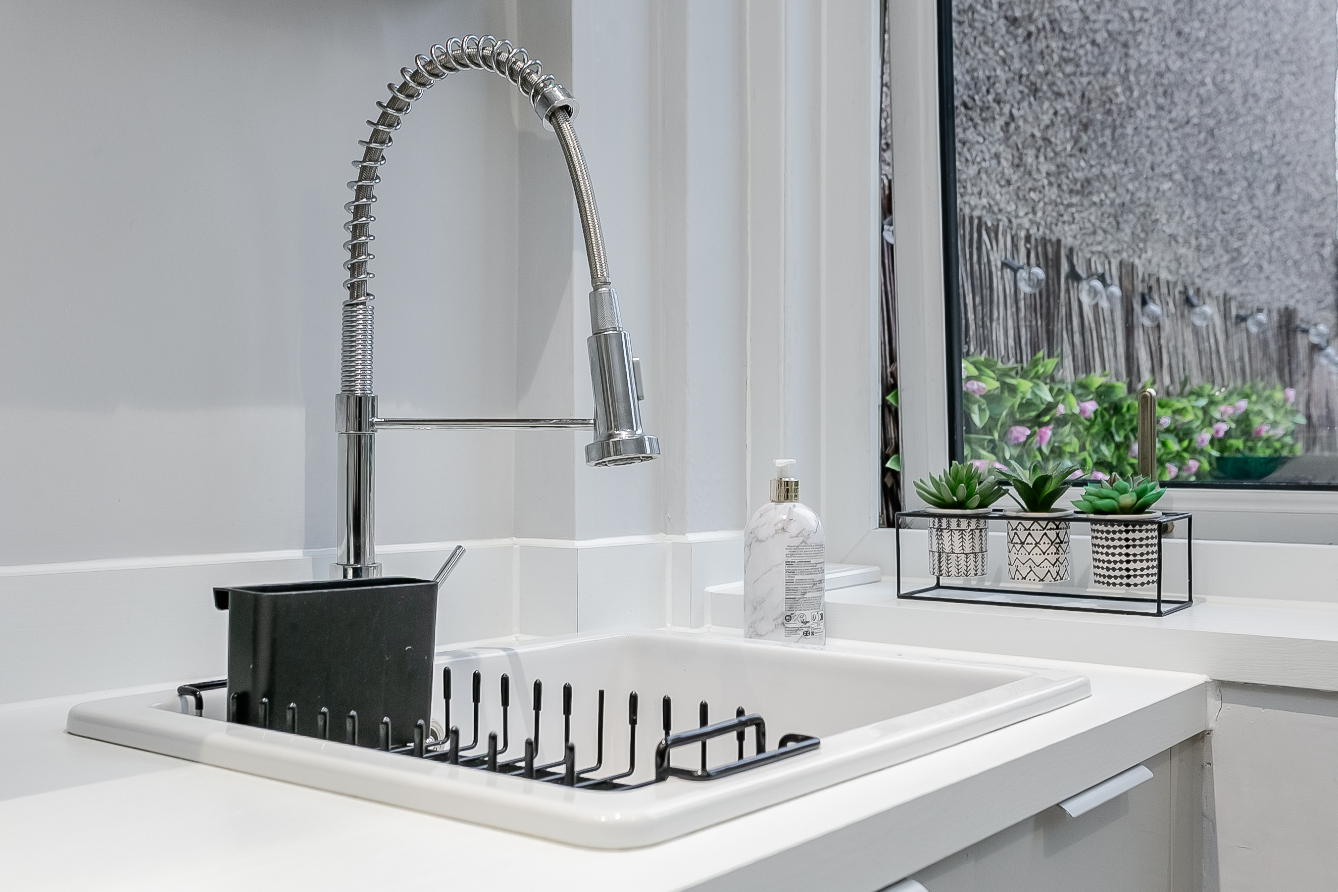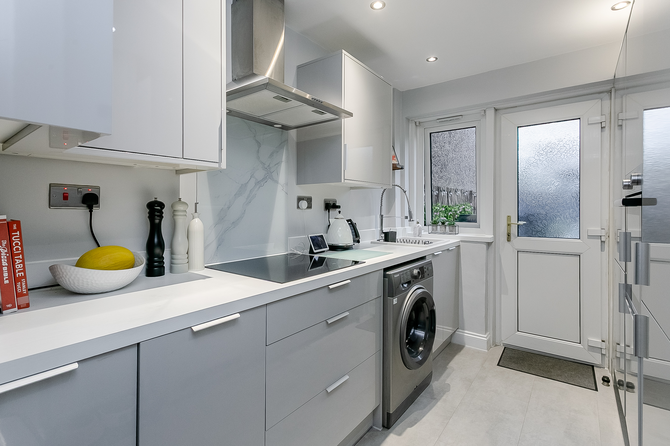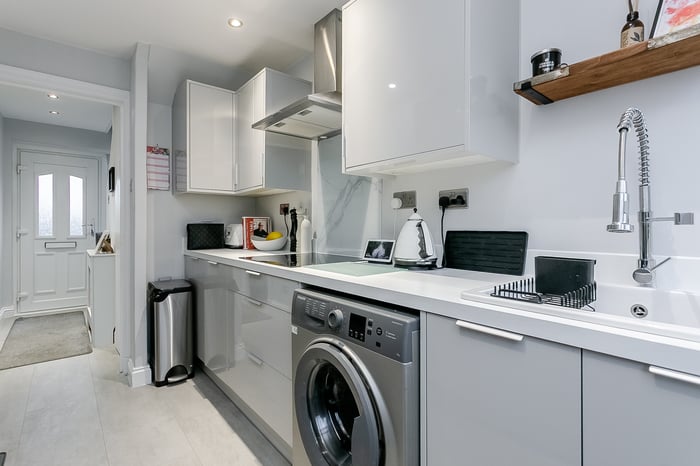 The modern fitted kitchen is finished to a high standard and features stone-effect worktops, wood-effect flooring and a stylish marble-effect splashback surround. Additional highlights include spotlighting, a modern sink with mixer tap and a further door leading out to the rear garden.