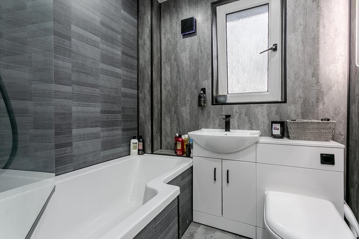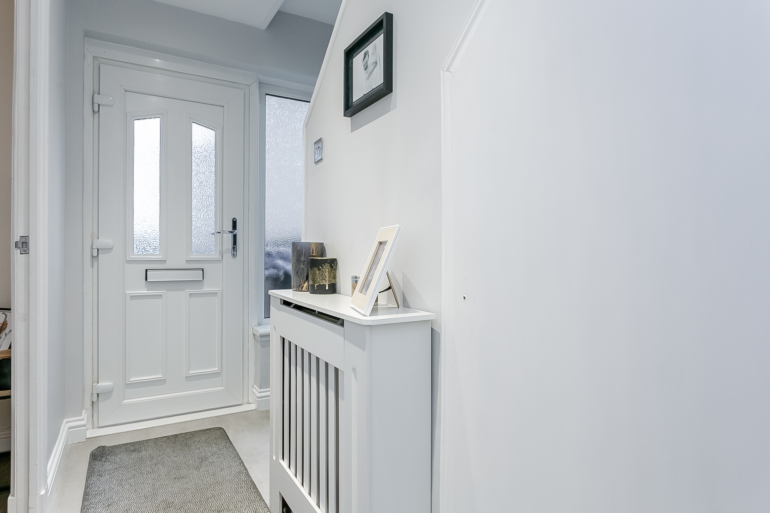 The second bedroom is also carpeted and well proportioned, making it suitable as a guest room, child’s bedroom or home office, and further benefits from a wall-mounted TV point. The accommodation is completed by the modern three-piece bathroom, which features stone-effect flooring, tiled and stone-effect splashback surround, spotlighting and an LED mirror.