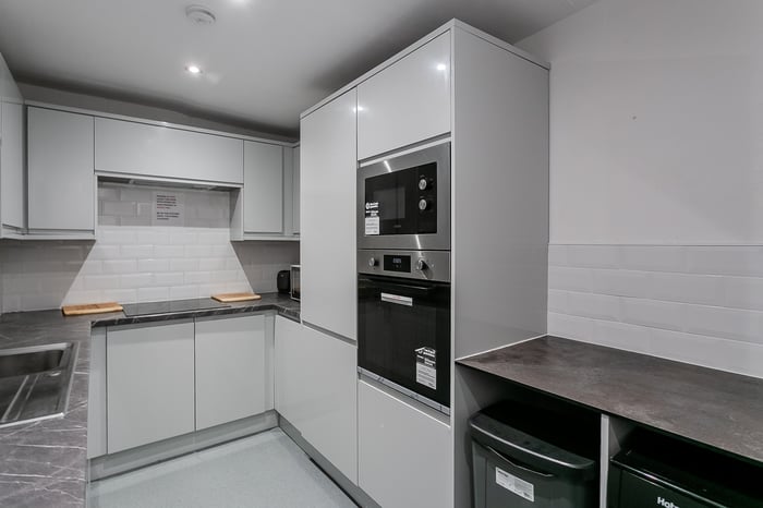 An entrance opens onto a balcony to the left, with the living room set to the side, featuring wood-effect flooring and light décor throughout, leading into the master bedroom just behind, which continues the same style and includes an en suite shower room with a three-piece suite and shower cubicle. The kitchen sits at the rear of the property, finished in a modern style with matching wood-effect flooring, granite-effect countertops, tiled splashback, and integrated appliances including an oven with electric hob and canopy above, as well as a microwave.