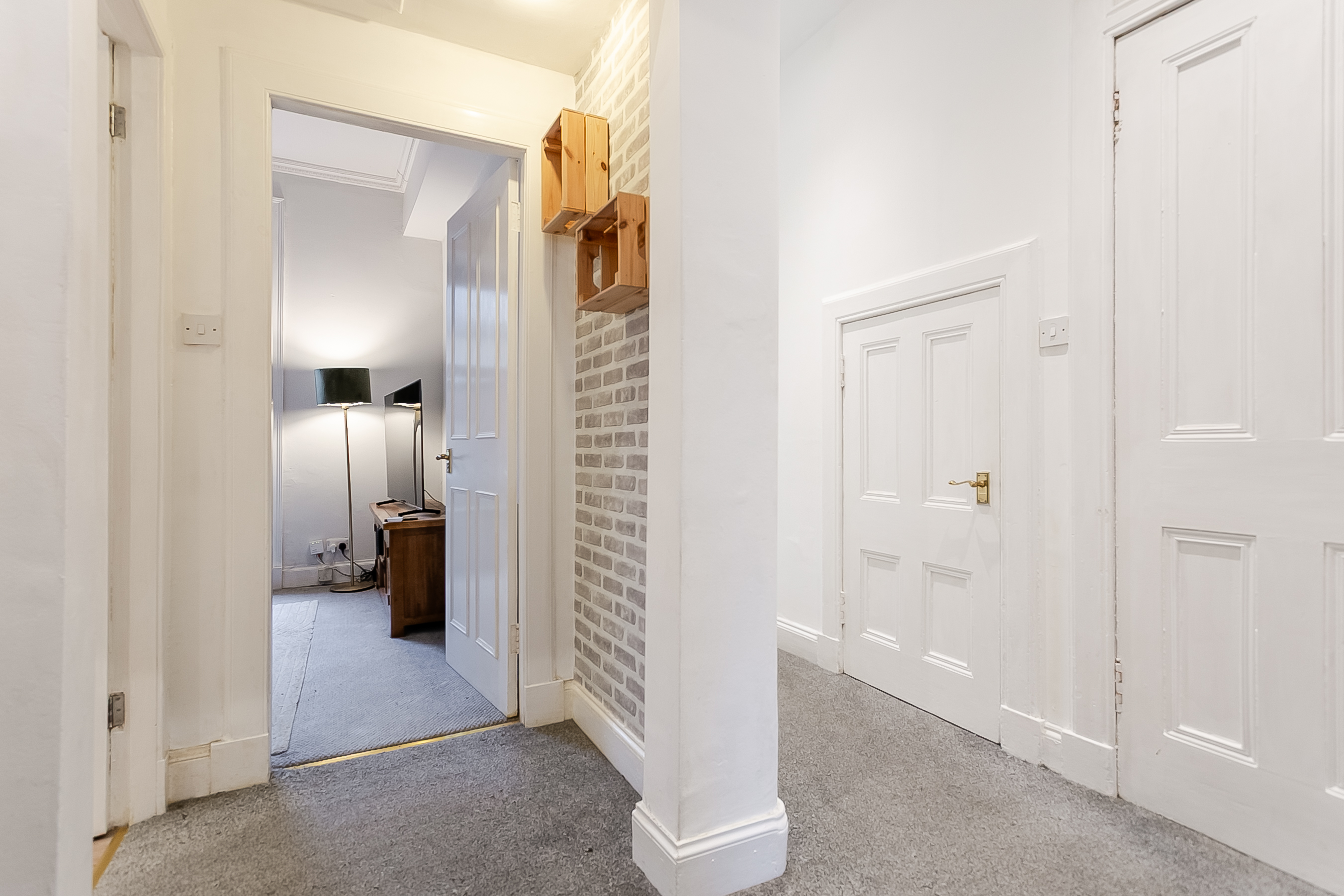 The hallway continues with carpeted flooring and is complemented by a useful utility cupboard offering space for additional appliances, as well as a large cupboard ideal for storage. The bedroom features matching contemporary flooring from the kitchen and benefits from a built-in wardrobe providing storage, along with a fireplace that adds warmth and character.