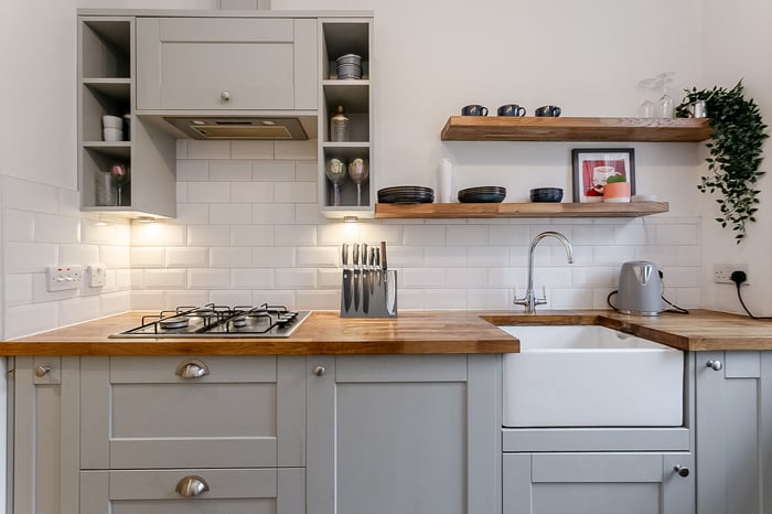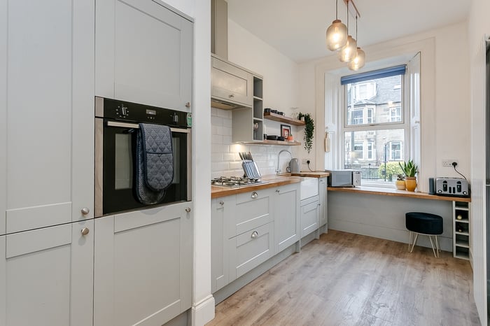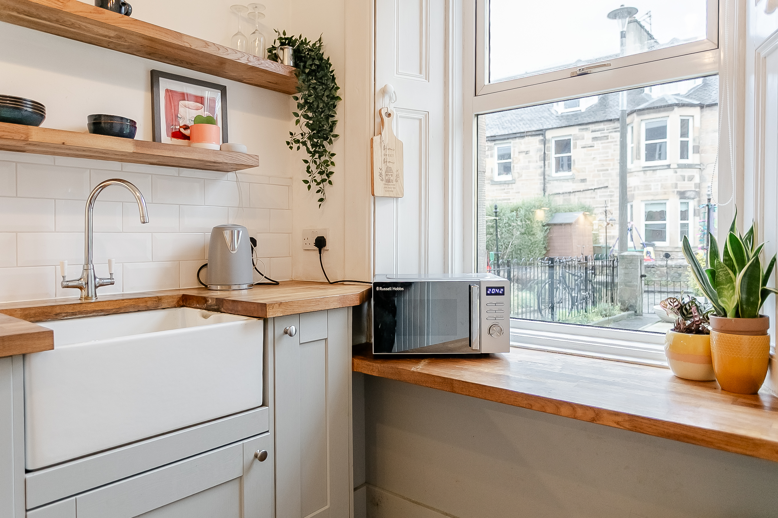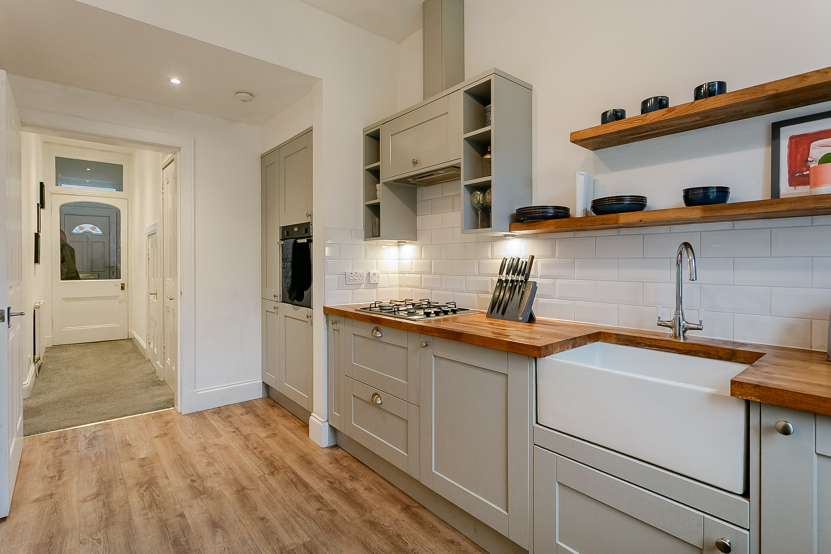 The living room features contemporary carpeted flooring and benefits from a charming window seat, creating a cosy yet versatile space ideal for both relaxing and entertaining guests. The kitchen is modern in finish, with contemporary wood-effect flooring, real wood worktops, a sleek tiled-effect splashback, and a Belfast sink with drainer, alongside an integrated oven, a gas hob with canopy above, and a fridge/freezer.