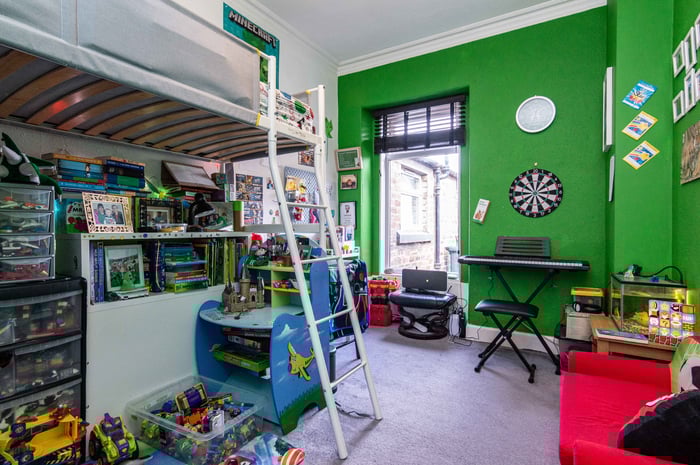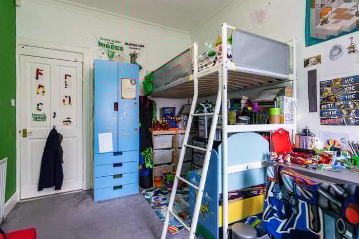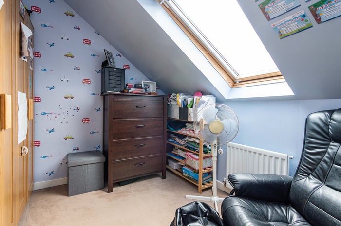 Set to the front, bedroom one has a decorative cornice, carpeted flooring, a TV wall mount and press shelving; whilst bedroom two is also on the ground floor, set to the rear, with carpeted flooring. Upstairs, two further bedrooms are similarly well finished, both with carpeted flooring, central light fittings and ample space for freestanding bedroom furniture.