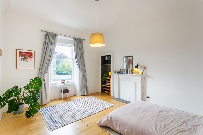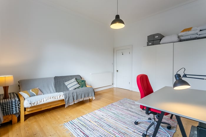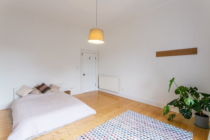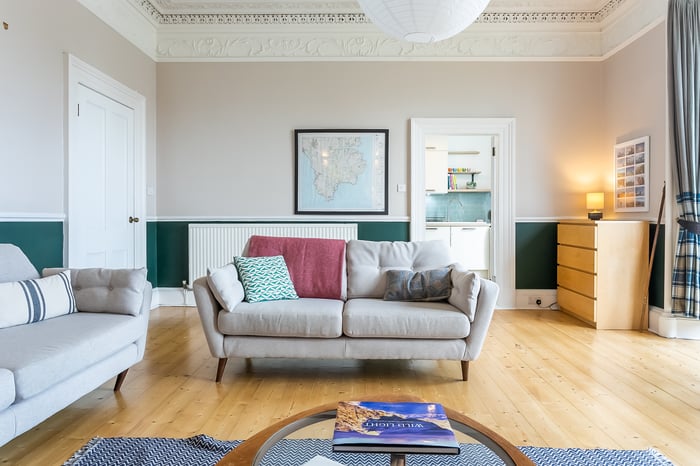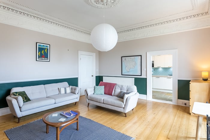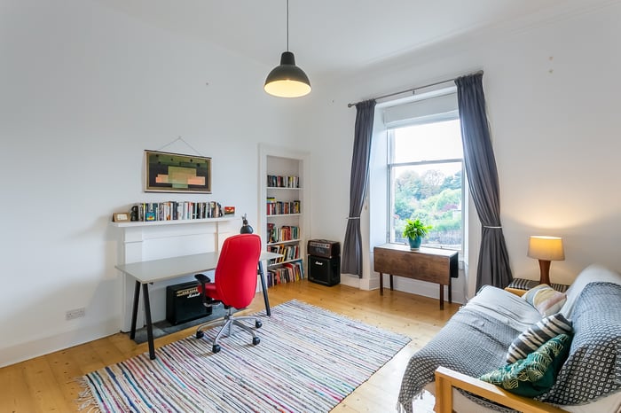 Beautifully presented and spacious, two-bedroom, first-floor villa, forming part of an impressive traditional stone-built terrace. Located on a leafy street in the sought-after Trinity area, northeast of Edinburgh centre. A welcoming entrance hall affords access throughout the majority of the property and features varnished hardwood flooring continuing into the public room and bedrooms.
