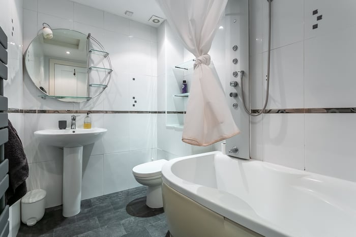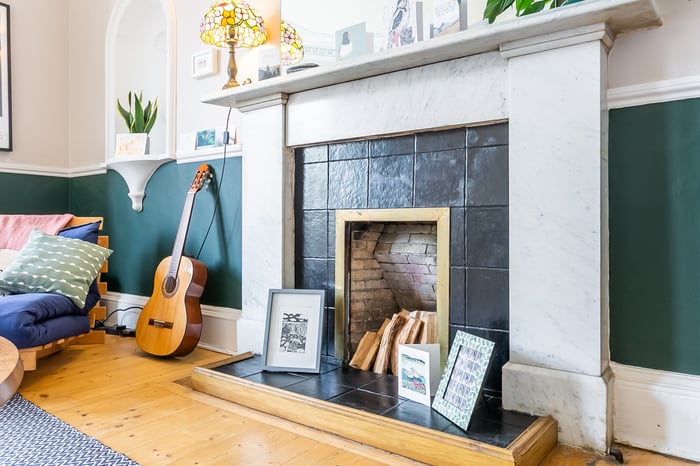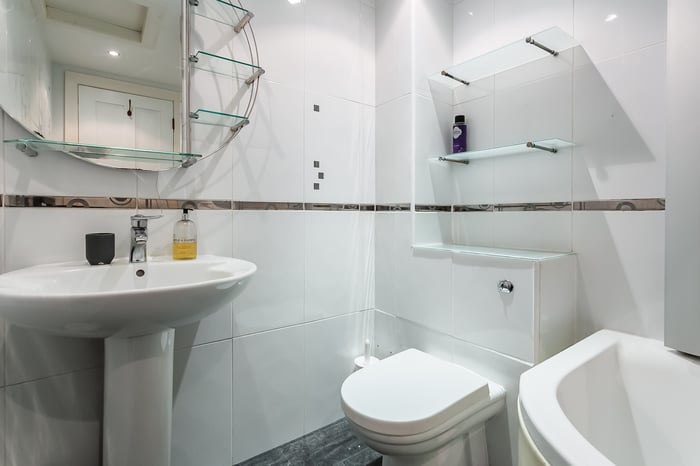 Set to the rear, two generous double bedrooms are similarly well-sized and finished, with light decor, feature fireplace surrounds, press shelves, and plenty of space for freestanding furnishing. Completing the accommodation, set internally off the hall, the bathroom is fitted with a modern three-piece suite including a shower over the bath, tiled splash walls, and a ladder-style radiator.