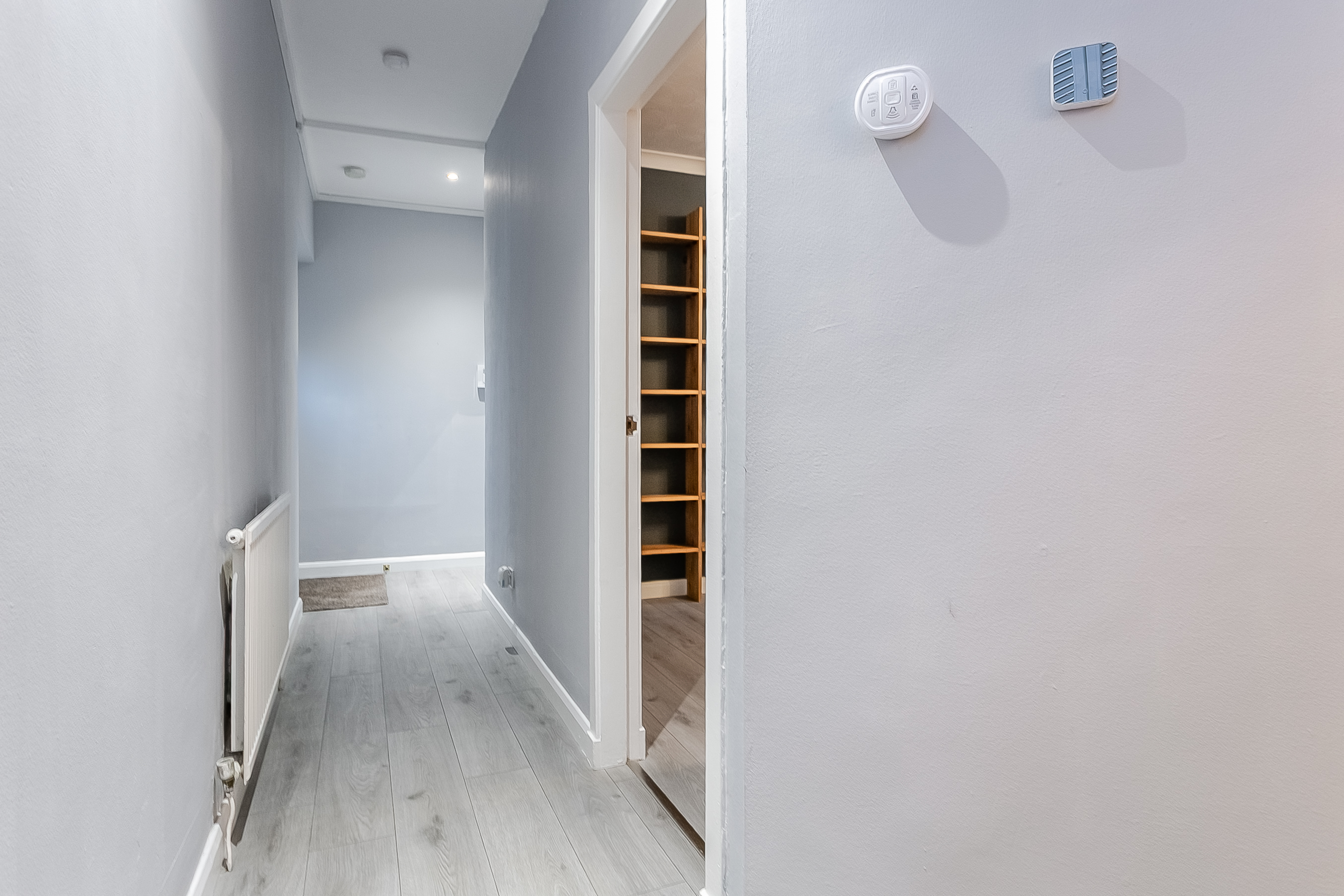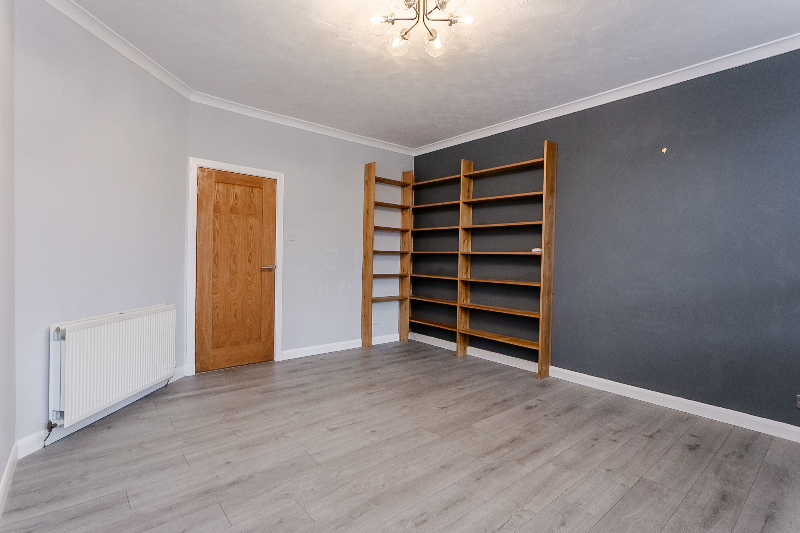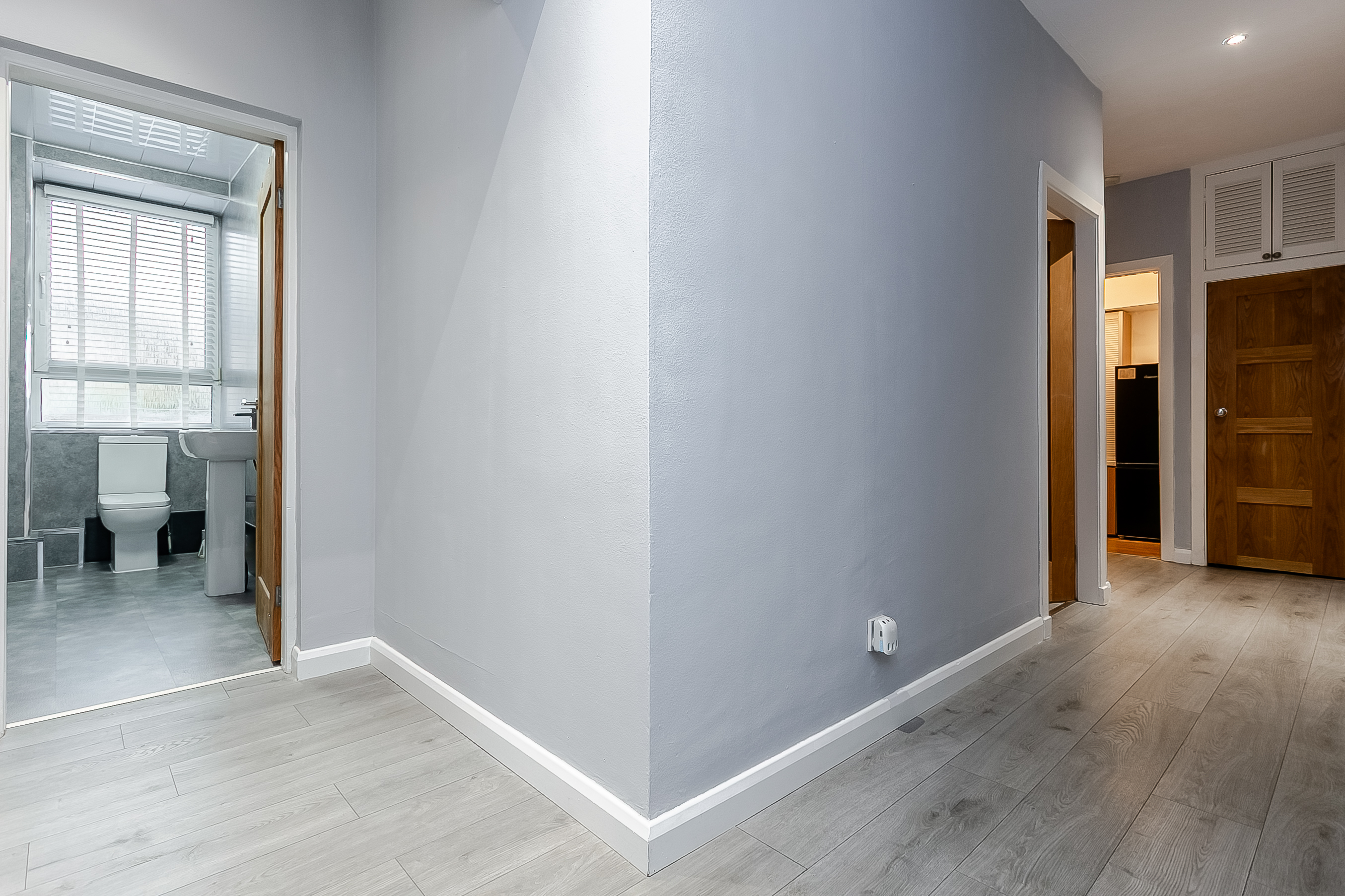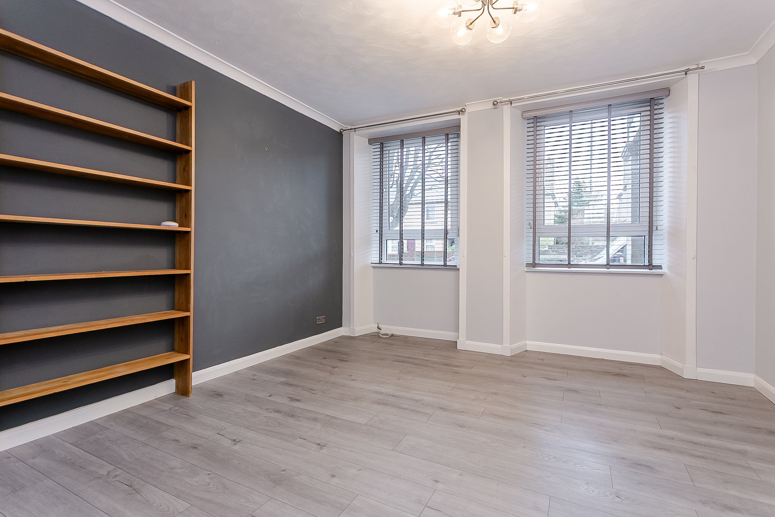 The welcoming entrance hallway provides access to all rooms within the property, creating a practical and well-laid-out home. The bright and spacious living room features attractive wood-effect flooring, a central light fitting and two well-positioned windows that allow an abundance of natural light to flow through the space.