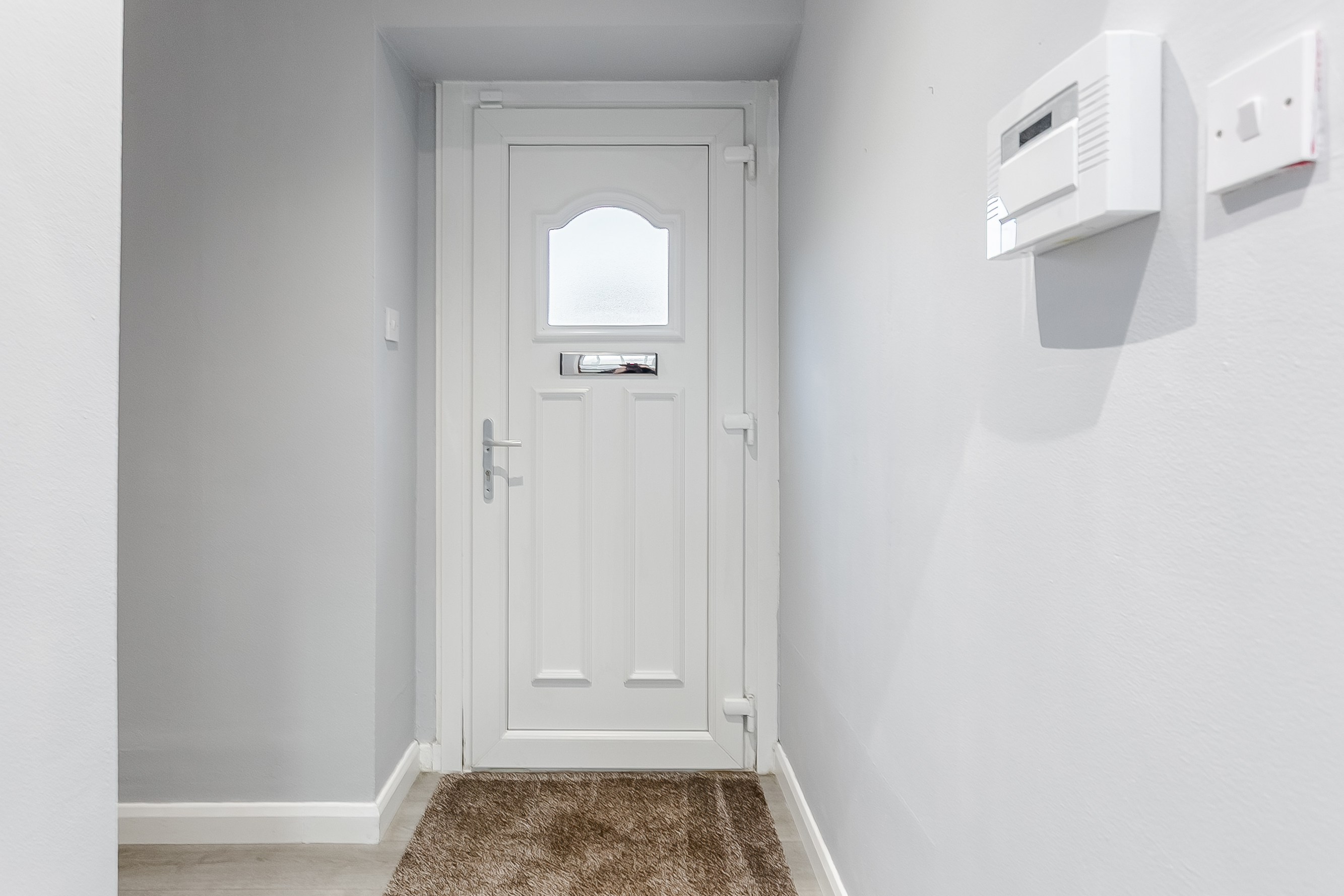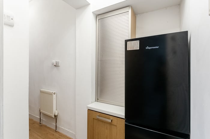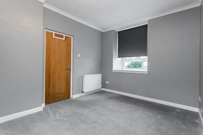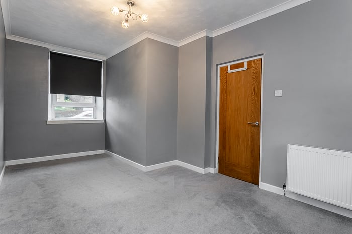 A hot water cupboard is conveniently located at the front of the property. The generously sized bedroom benefits from soft carpeted flooring, a central light fitting and plenty of space for a double bed, along with additional bedroom furniture such as wardrobes or drawers, offering a comfortable and restful retreat.