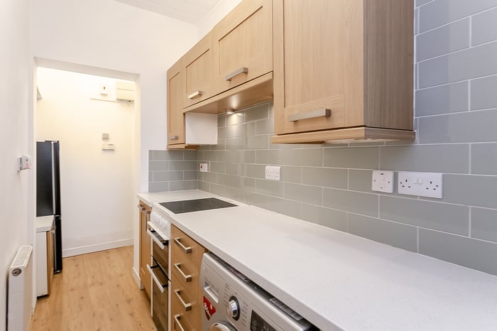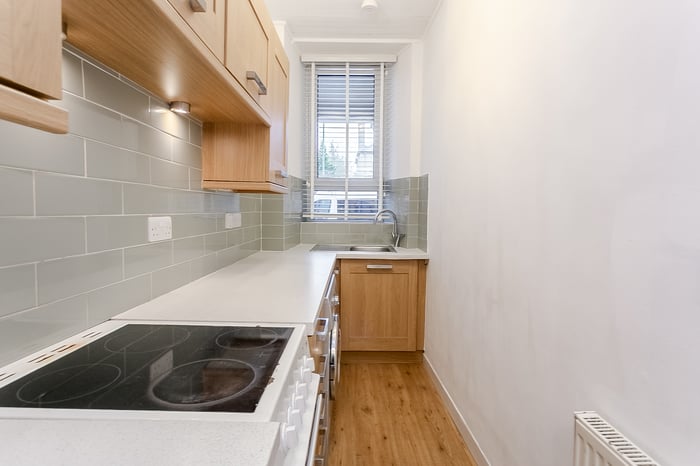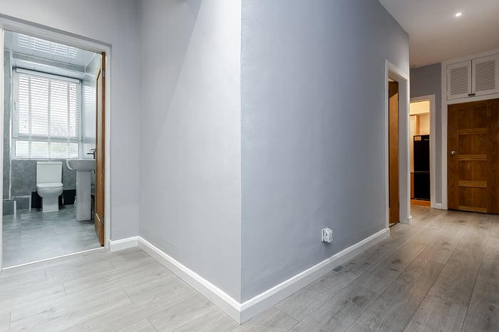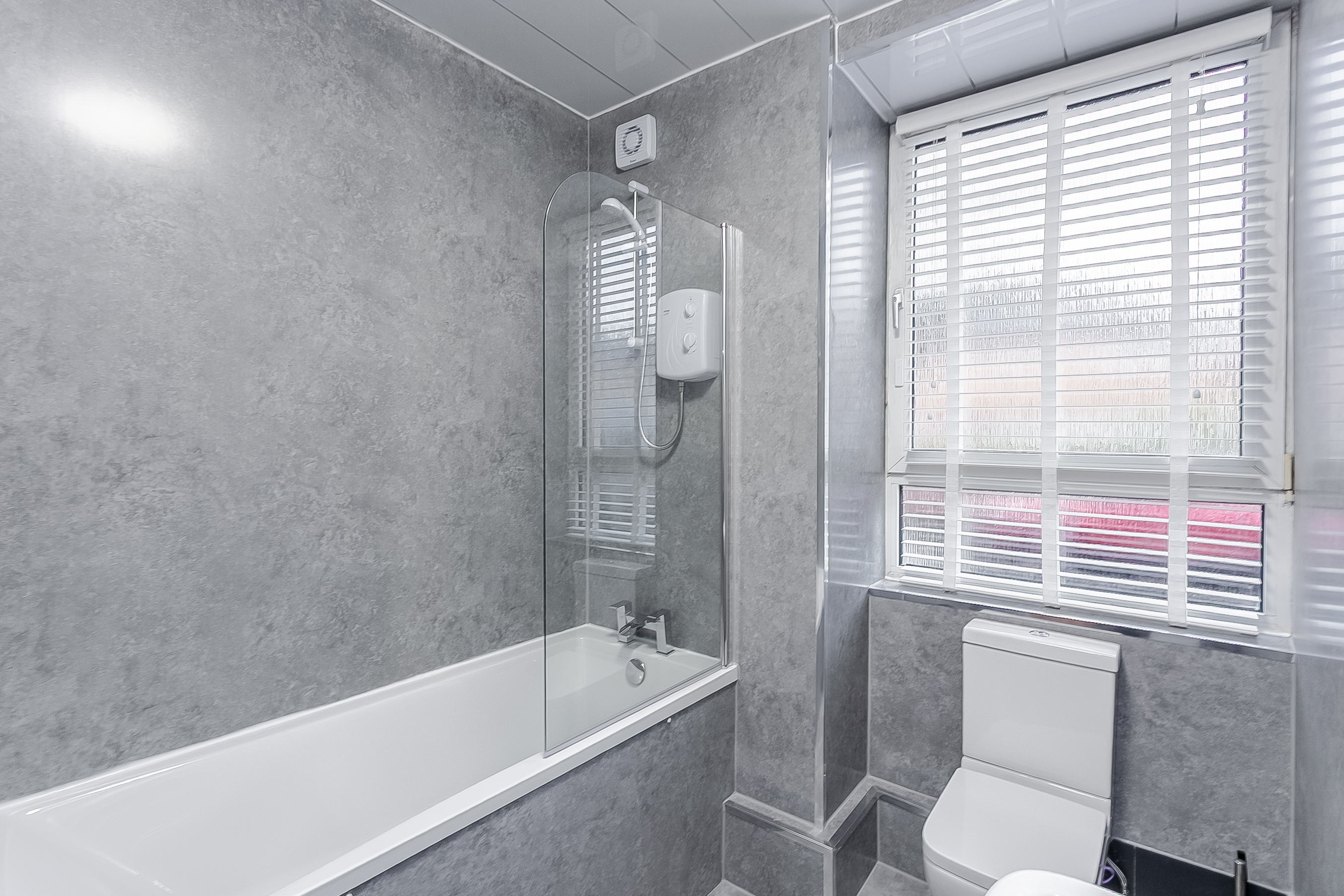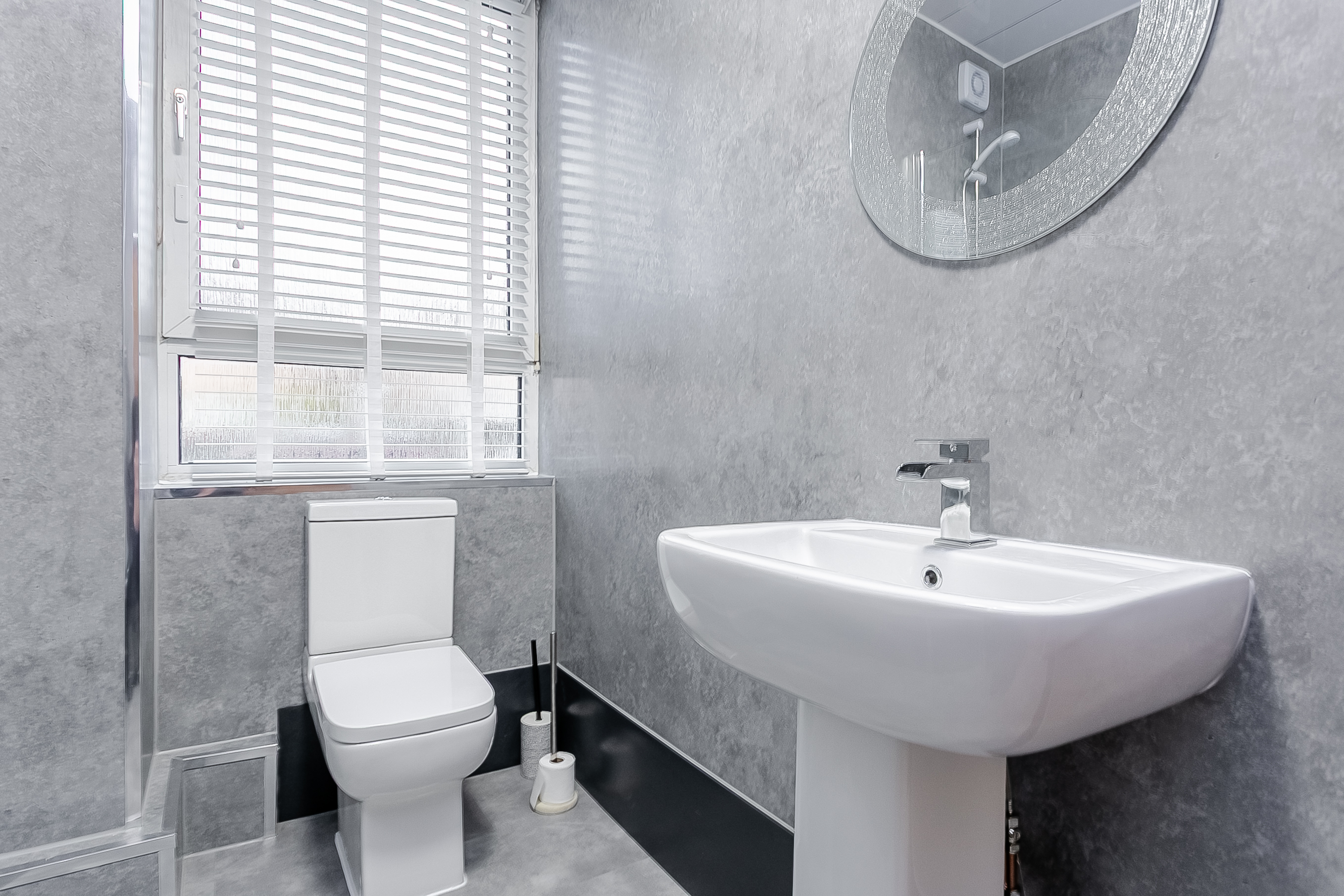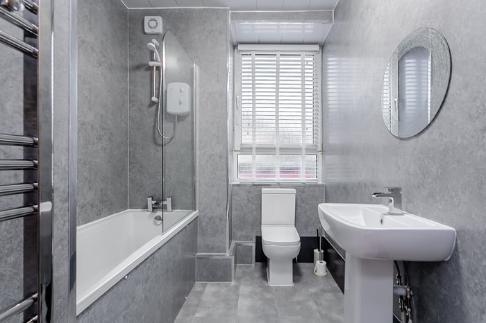 Completing the property is a modern, well-presented three-piece bathroom comprising tiled-effect flooring, a stone-effect splashback surround, a central light fitting and a ladder-style heated radiator.