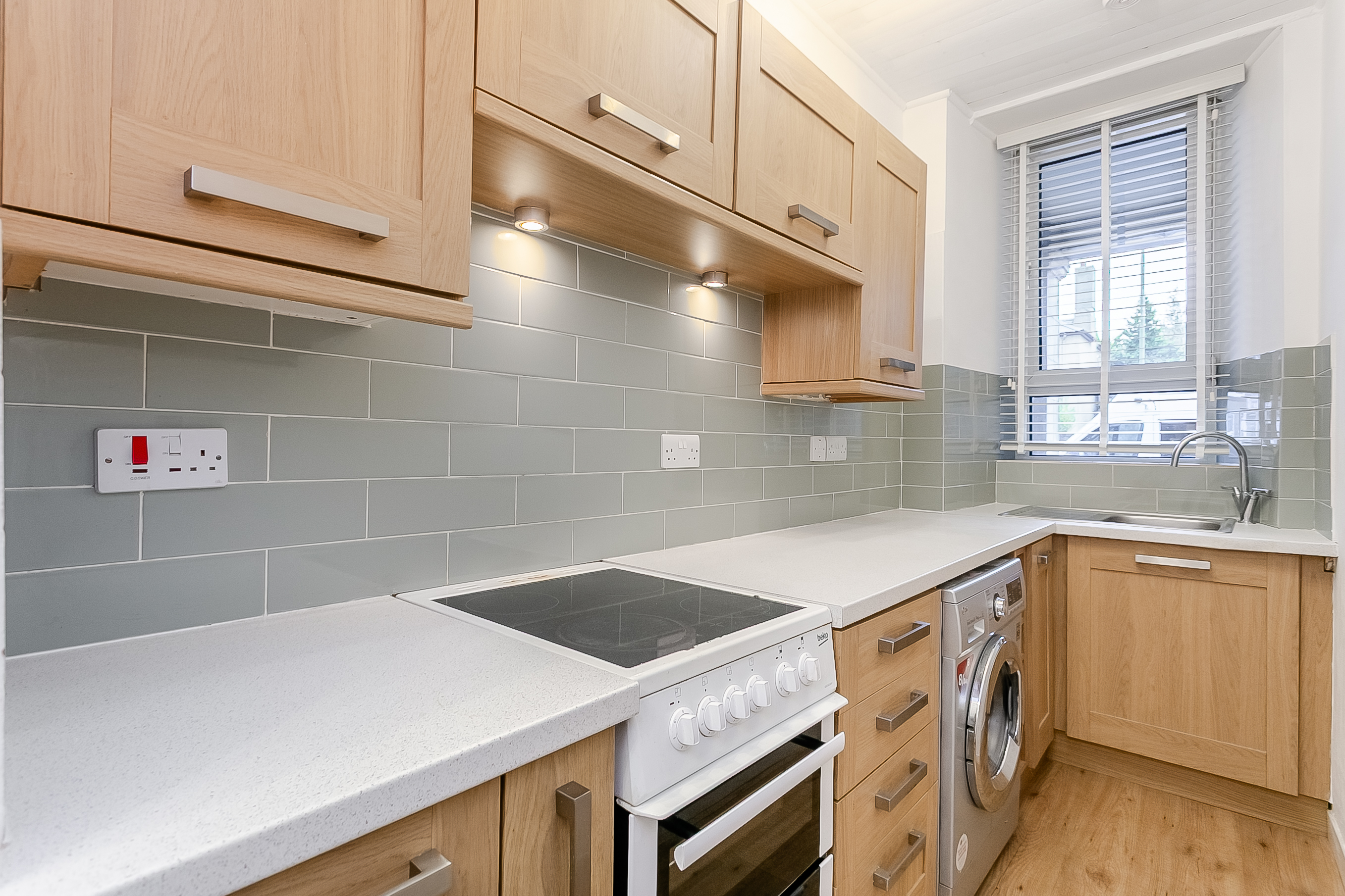 Additional features include under-cabinet lighting and a stainless steel sink with a drainer. Integrated and freestanding appliances include a fridge freezer, washing machine and a cooker with an electric hob.