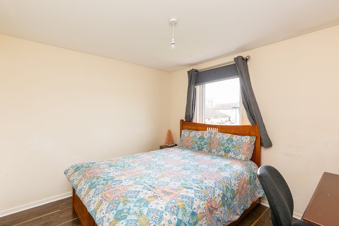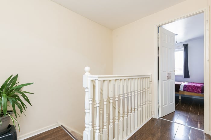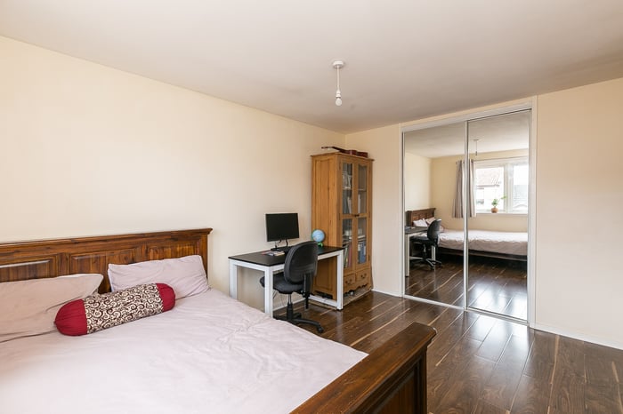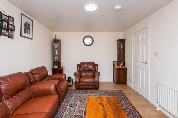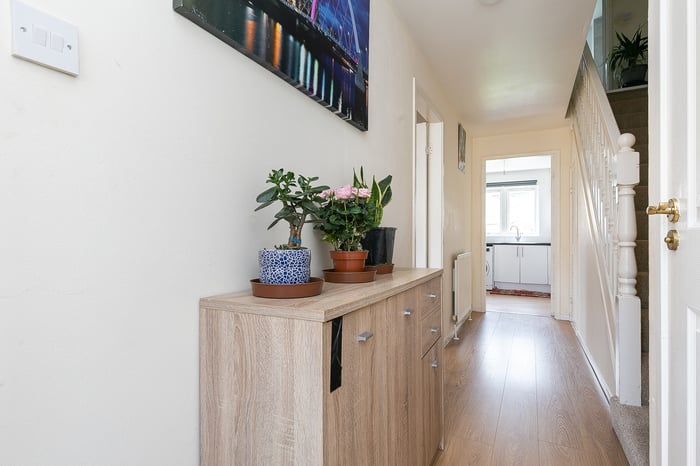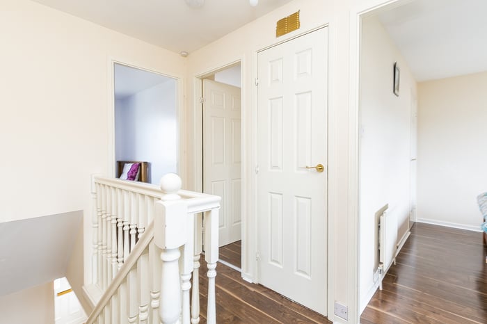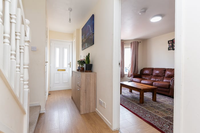 On the upper hall, generously sized bedroom one is to the front featuring wood effect flooring and a built-in wardrobe with mirror sliding doors; whilst two further bedrooms are similarly well-finished, also with wood effect flooring and built-in wardrobe storage. Completing the accommodation, the bathroom is set to the rear, fitted with a three-piece suite, a shower over the bath and tiled splash walls.