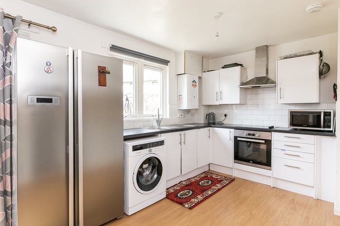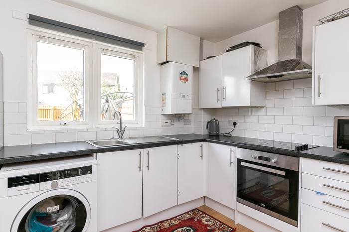 To the rear, the kitchen offers ample space for dining, patio doors accessing the southerly-west-facing rear garden and good storage provision with two built-in open storage spaces. Modern fitted units include an integrated oven and induction hob; a tiled surround and a sink with drainer.