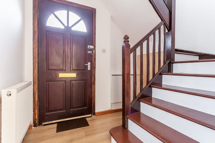 A welcoming entrance hall offers useful storage, including an under-stair cupboard, and leads to a bright, south-facing living room that benefits from wood-effect flooring, an open shelved press, and a walk-in cupboard. To the rear, the dining kitchen features modern fitted units, wood-effect worktops, a tiled splashback, and integrated appliances, including an oven and gas hob with a stainless steel splashback and canopy, whilst a door provides direct access to the extensive rear garden.