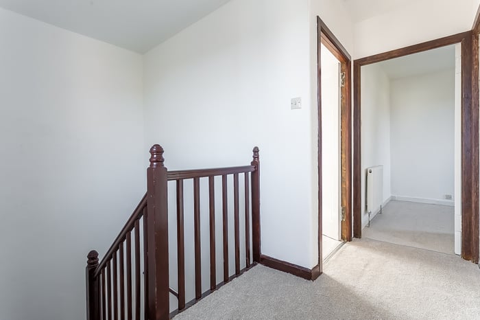 Completing the ground floor is a modern shower room with a large walk-in cubicle, contemporary wall panelling, and dual-aspect windows. Upstairs, the carpeted landing benefits from a side window for additional light, whilst the principal bedroom offers a deep walk-in store cupboard and open views to Arthur’s Seat.