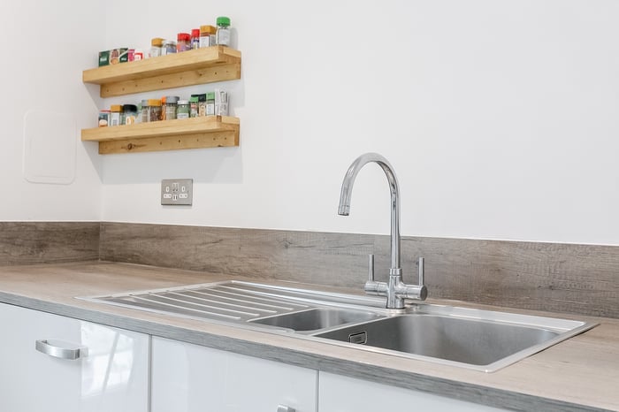 The modern fitted kitchen includes sleek tiled flooring, wood-effect worktops, stylish spotlighting, and a stainless-steel sink with a drainer. Integrated appliances comprise a fridge/freezer, dishwasher, washing machine, oven, and induction hob with a canopy above, providing a practical yet contemporary cooking environment.