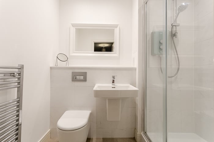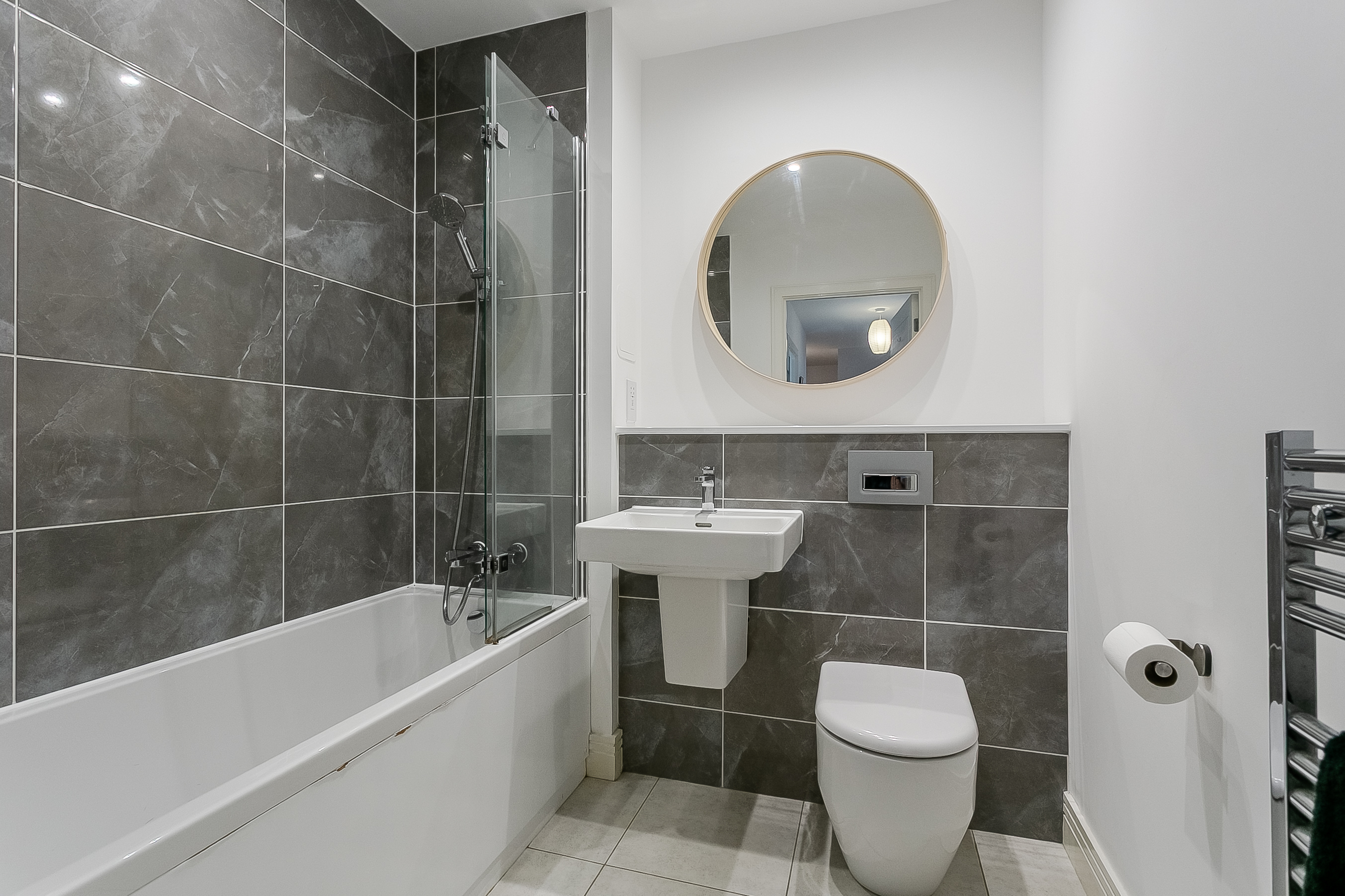Completing the property, the stylish three-piece bathroom is fitted with a tiled splashback surround, tiled flooring, spotlighting, a shower over the bath, and a ladder-style radiator, creating a modern and relaxing finish.