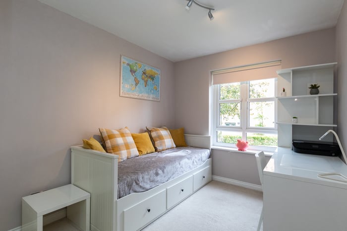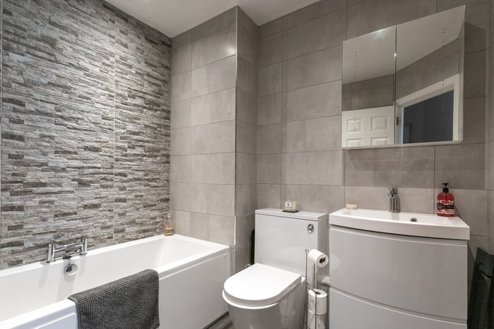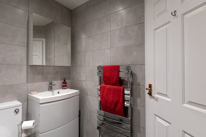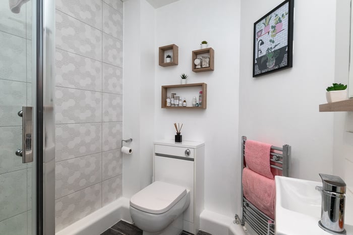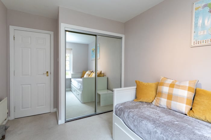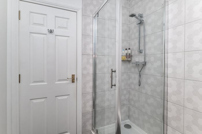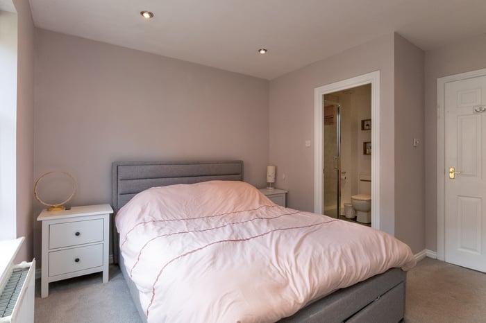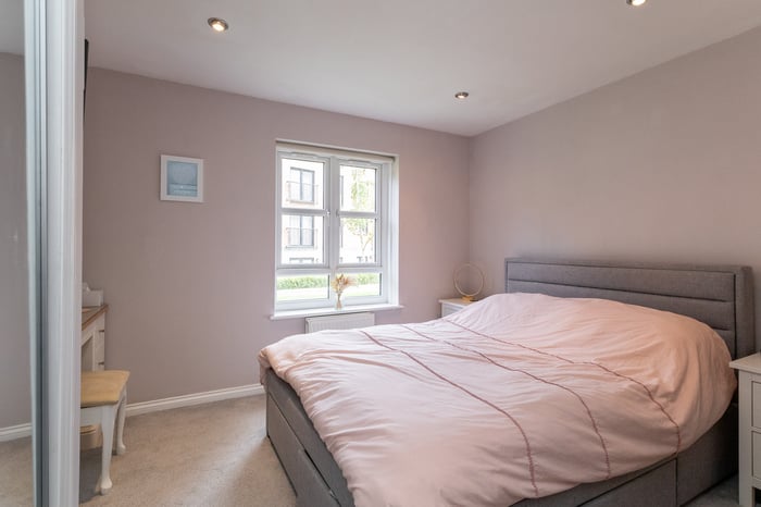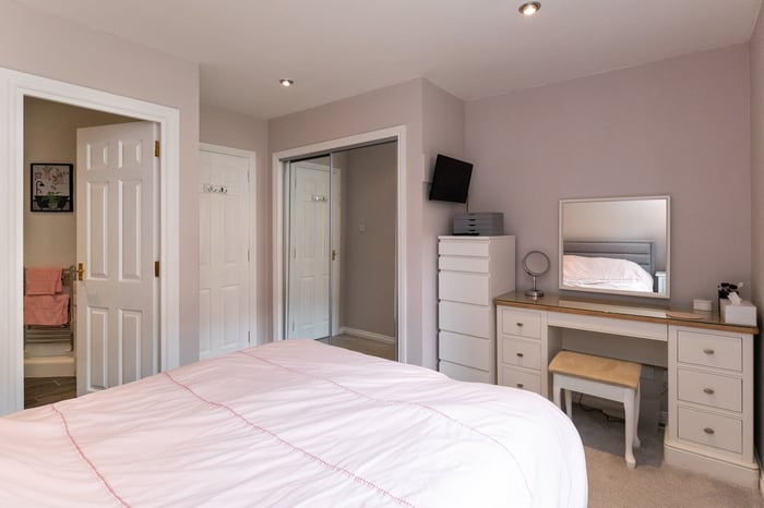 The master bedroom features carpeted flooring, a stylish en-suite shower room and a built-in wardrobe with mirror sliding doors; whilst bedroom two is similarly well finished, also with carpeted flooring and a built-in wardrobe with mirror sliding doors. Completing the accommodation, the fully tiled bathroom is fitted with a three-piece suite, a shower over the bath with a rainfall shower head and a ladder-style radiator.