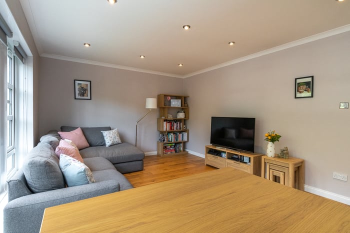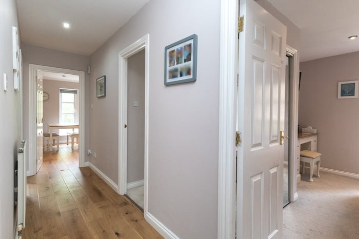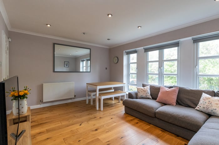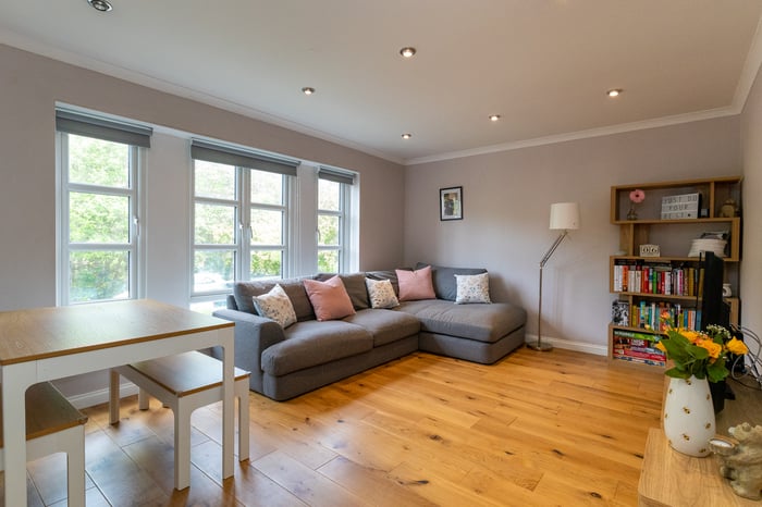 The entrance hall has a storage cupboard and wood effect flooring, and provides access throughout the apartment. The spacious dining/living room is set to the rear with spotlights, large windows and ample space for both lounge and dining furniture.