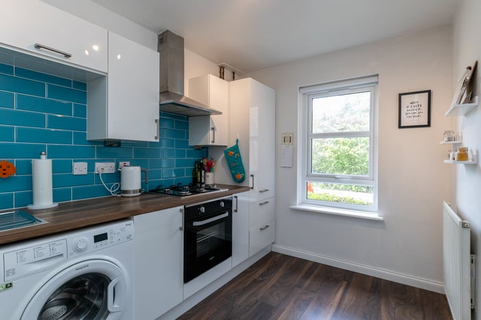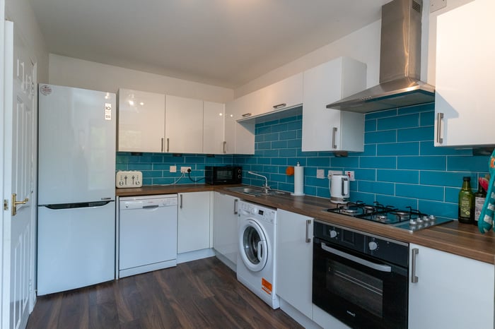 Also to the rear, the kitchen is fitted with modern units, wood effect worktops, a sink with drainer and a tiled surround. Appliances include an integrated oven, gas hob and extractor hood; and a freestanding washing machine, fridge/freezer and dishwasher.
