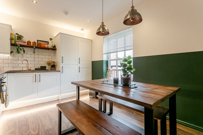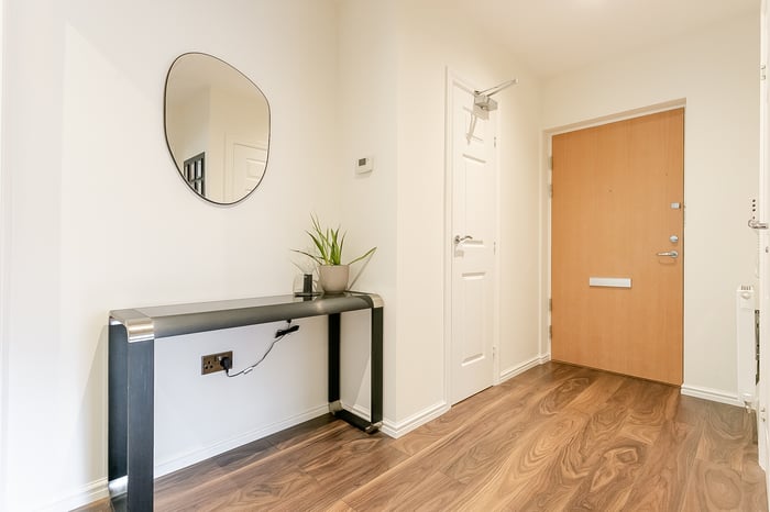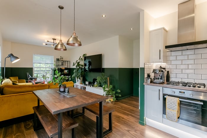 A welcoming entrance hall with a useful storage cupboard sets the tone for the rest of the property, leading through to a stunning open-plan living, dining, and kitchen area. Benefiting from a desirable corner aspect, this generous, bright and airy space is enhanced by wood-effect flooring, tasteful décor, a wall-mounted TV point, and a contemporary light fitting over the dining area.