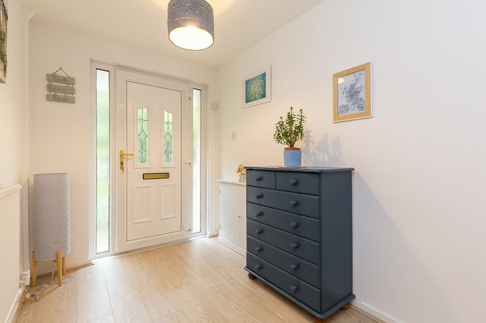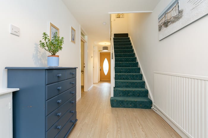The common entrance is from the rear garden via the street side aspect, an entrance porch offers ample space for outerwear and opens to the main hall. The hall gives access throughout the ground floor and to the carpeted stairway, and features a large built-in store, further under stair storage space, and ample space for free-standing furniture at the opposite entrance.