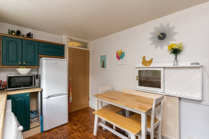 A good-sized public room has a leafy view, and includes quality contemporary flooring matched from the hall, an electric fireplace with tasteful surround and a pass-through to the kitchen. The kitchen is rear facing and can accommodate a dinner/breakfast table, whilst fitted units feature stone-effect worktops, a sink with drainer, and an integrated double oven and ceramic hob.