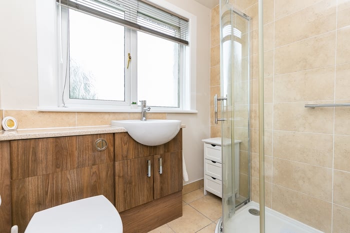 The modern shower room has a rear-facing window and has a fitted suite, a corner cubicle with a mains mixer shower, tiled flooring and splash walls.