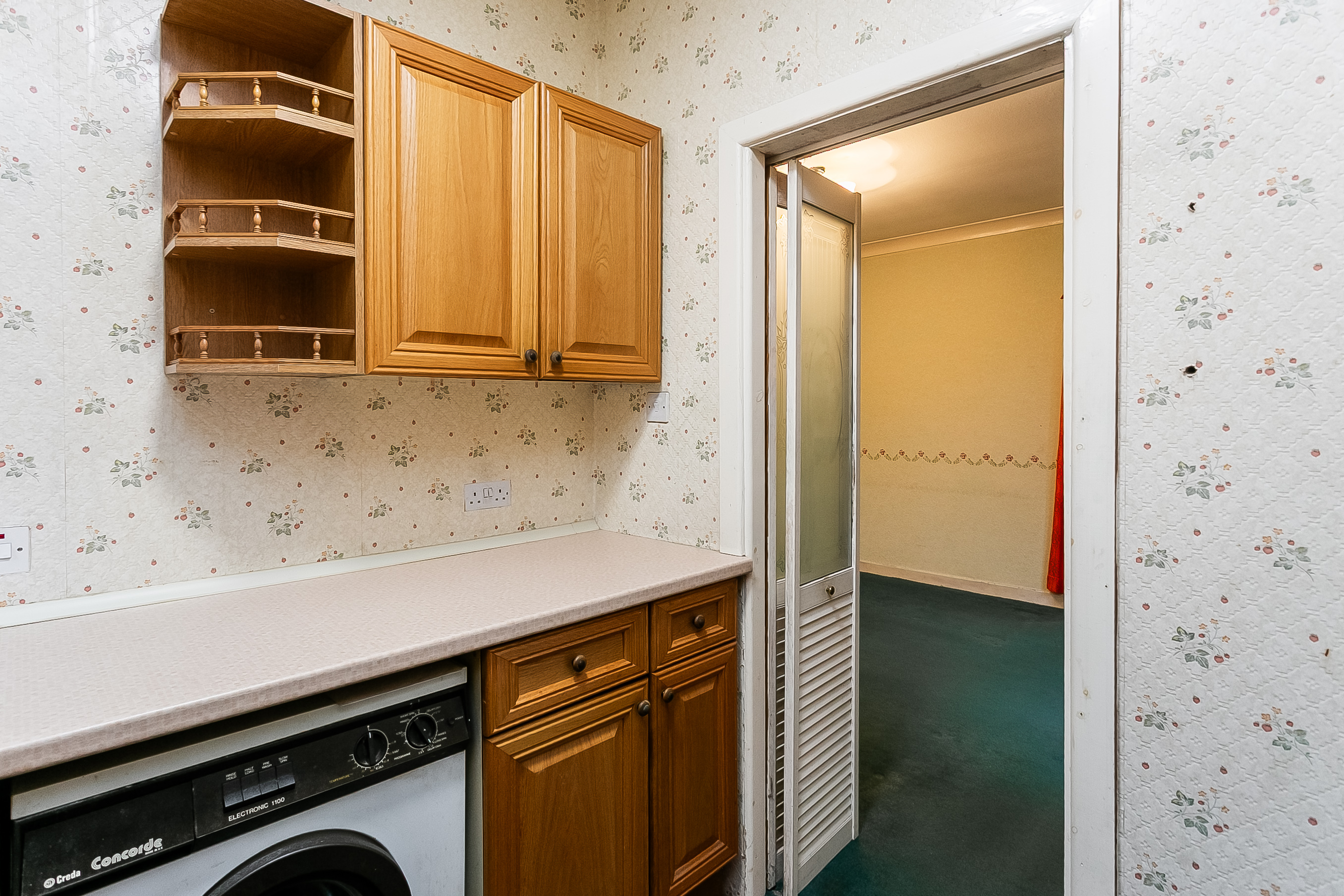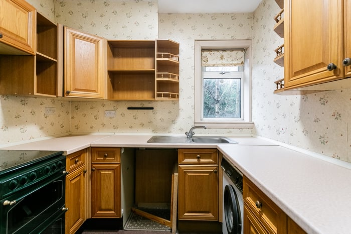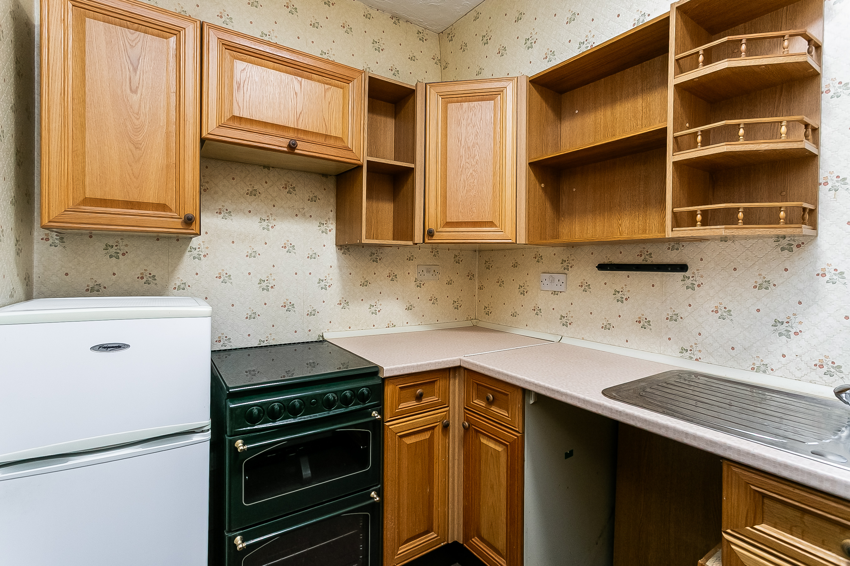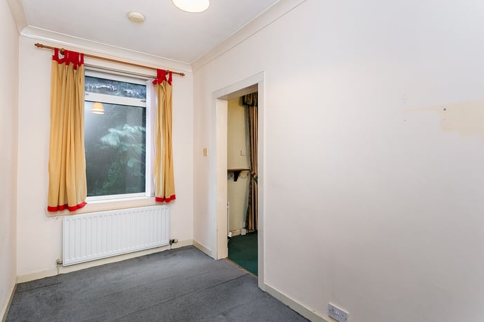 Also accessed from the living room is the fitted kitchen, equipped with wall and base units, worktops, a sink with drainer, a gas cooker with double oven, a fridge/freezer and a washing machine. To the front of the property, the main bedroom is a generous double and features a charming bay window along with a built-in cupboard.