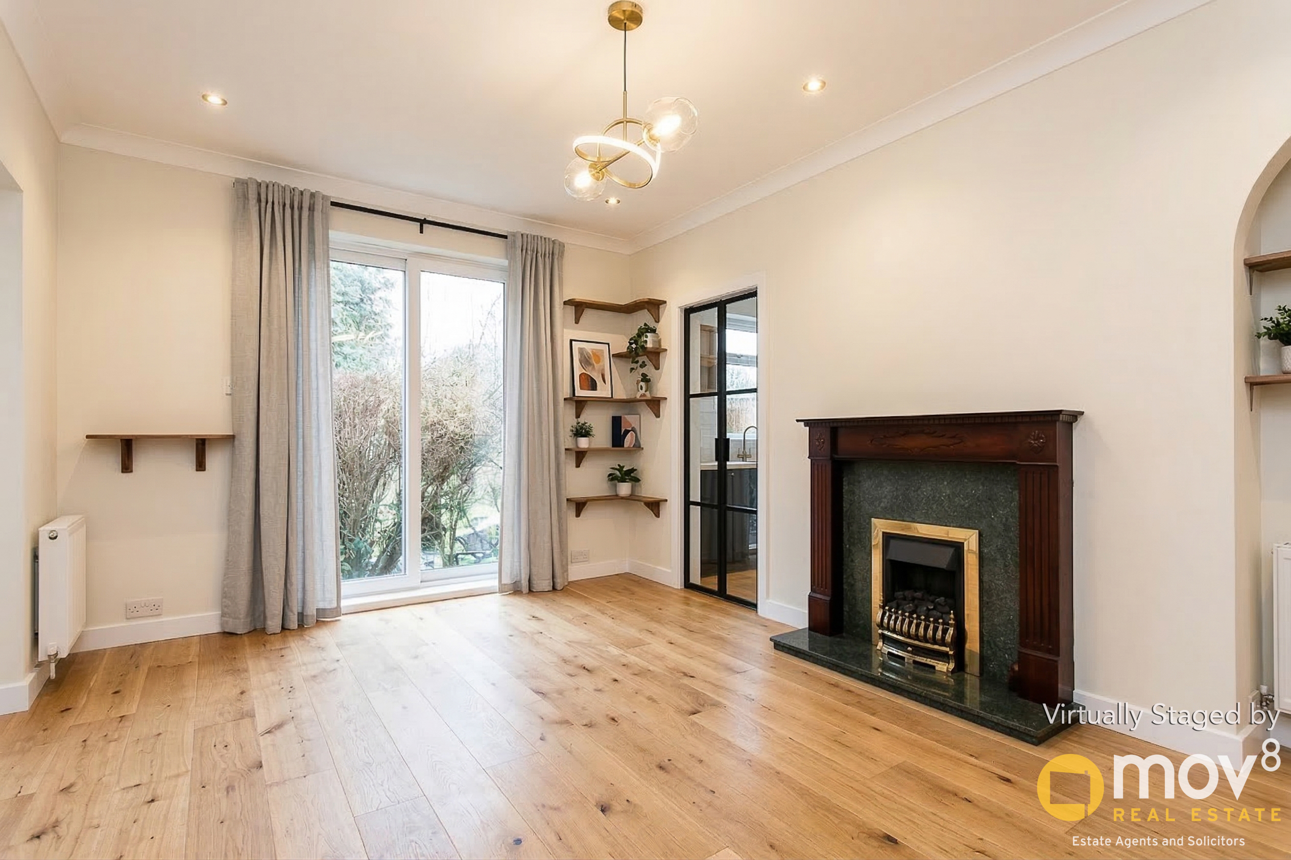 The room features a fireplace, a shelved press and patio doors opening directly to the garden. Set off the living room is a flexible dining room which could equally serve as a guest bedroom, study or home office.