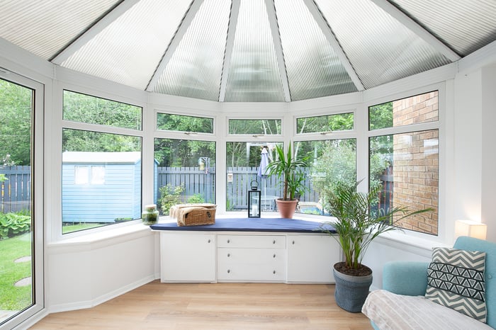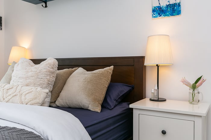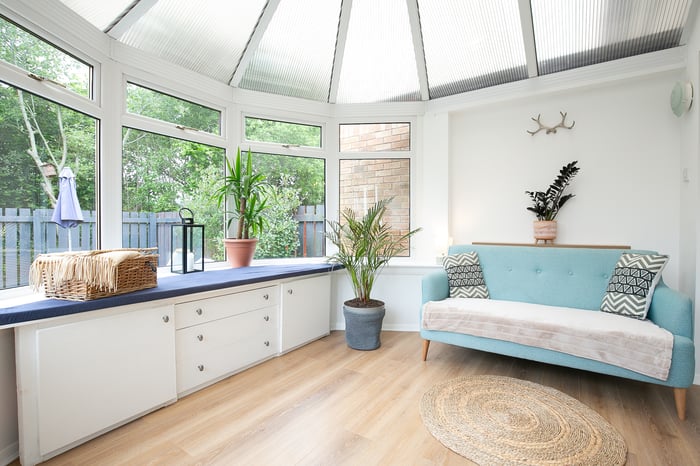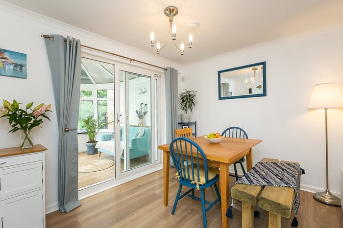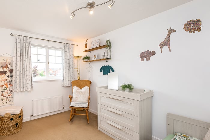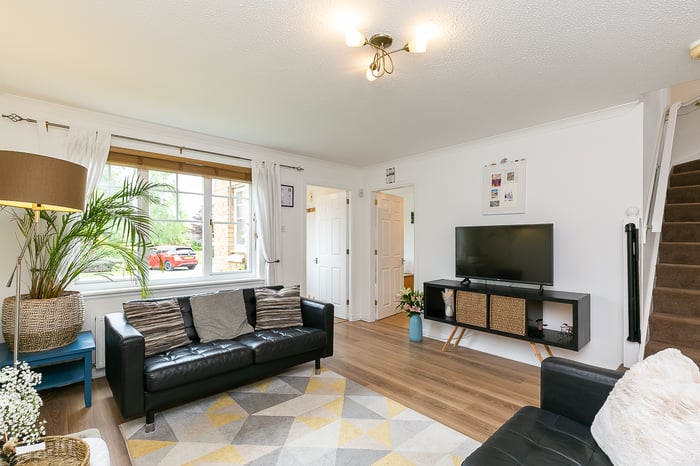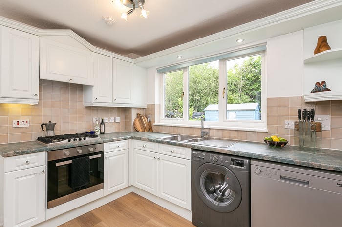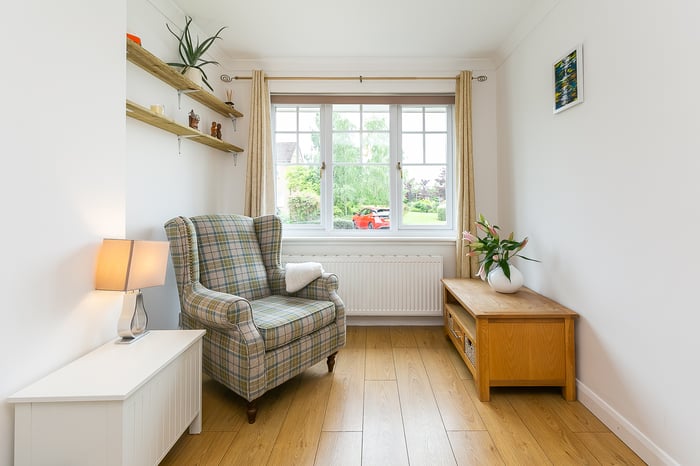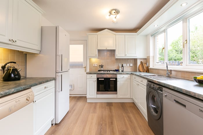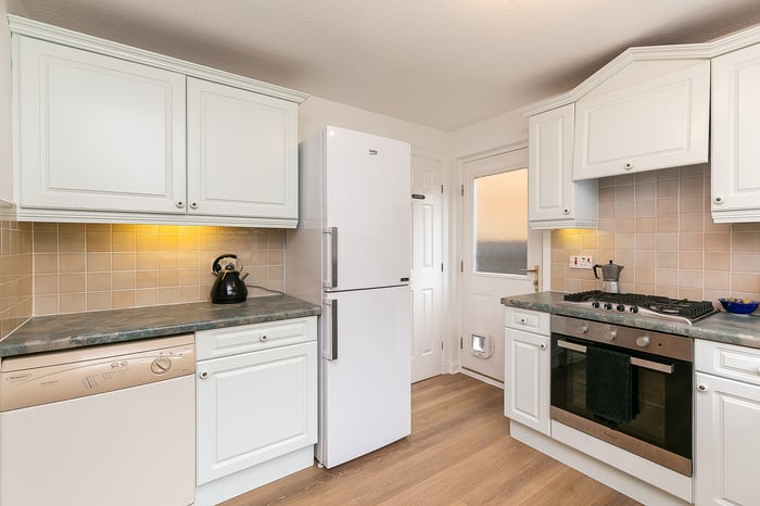 Fitted kitchen units include stone-effect worktops, a tiled surround, a sink with drainer, unit downlighting; and an integrated oven, gas hob and canopy. Set off the lounge with a front-facing window is a flexible fourth bedroom, offering a potential family/TV room, and includes built-in wardrobes.