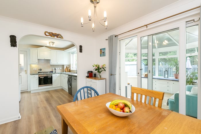 Light, beautifully presented and spacious, flexible four-bedroom, semi-detached family home, with gardens and a driveway. Located in a modern, maintained, and family-orientated residential development in Bonnyrigg, Midlothian. The entrance porch has ample space for outerwear, and opens into the southerly-facing front-set living room featuring wood-effect flooring and affords access to the kitchen, bedroom four, and the carpeted stairway leading to the upper hall. Set to the rear, is a spacious, open-plan dining room and kitchen, with patio doors to a generous conservatory, wood-effect flooring, a side aspect door, and access to a deep pantry/store cupboard.