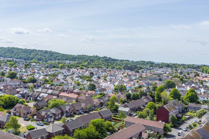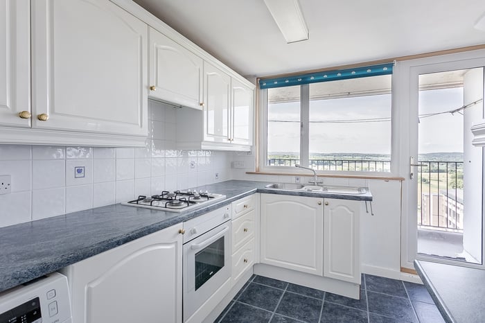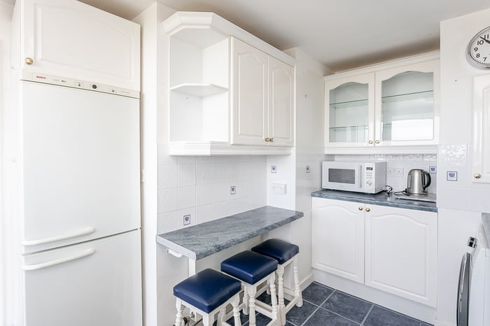The kitchen itself is fitted with stone-effect worktops, an integrated oven and hob, with freestanding appliances including a washing machine and fridge/freezer. Both double bedrooms are well-sized, positioned side by side, and offer flexibility for various furnishings.