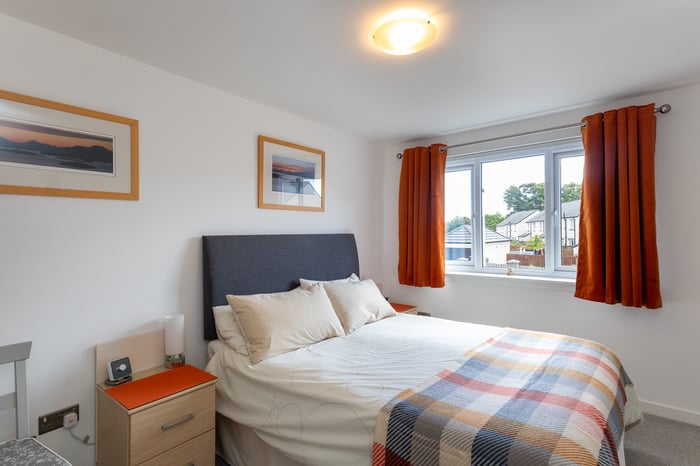 On the upper floor, the master bedroom is set to the front, tastefully finished, with light decor, carpeted flooring, a built-in cupboard, and a stylish en-suite shower room. Two further well-finished bedrooms are set to the rear, similarly sized, featuring light decor and carpeted flooring.