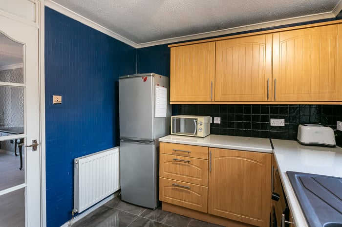 Set the front, a generously sized living room offers space for both lounge and dining furniture and features wood effect flooring continuing from the hall. Set off the living room, the kitchen is fitted with modern units and worktops, a sink with drainer and a tiled surround, with appliances including an electric cooker, washing machine and fridge/freezer.