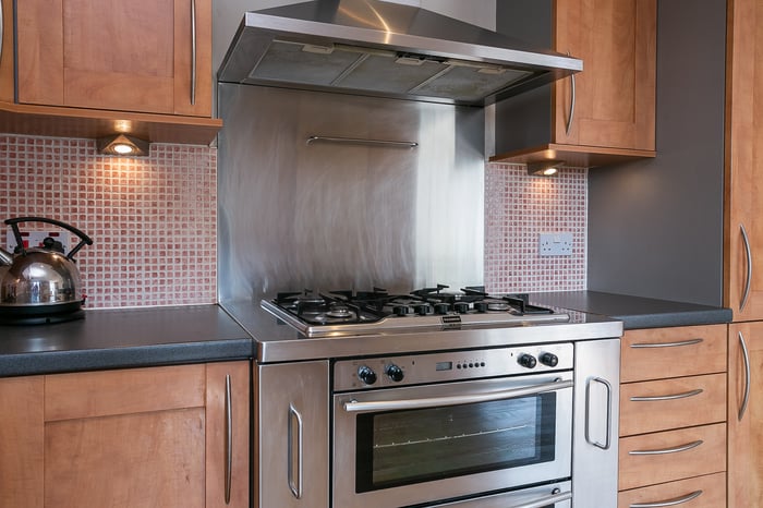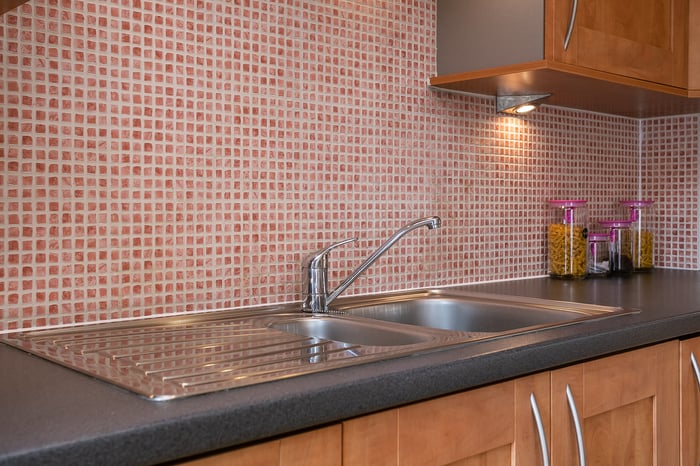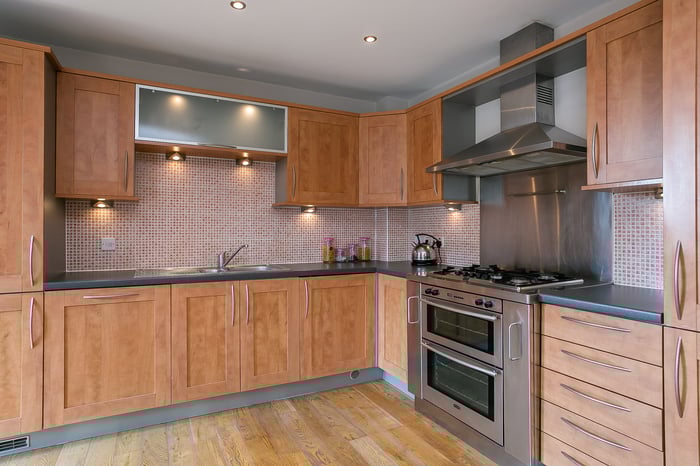 This offers ample room for both lounge and dining furniture whilst giving access, through French patio doors, to a large private terrace. The modern kitchen features stone-effect worktops, a sink with a drainer, a mosaic-tiled surround, unit downlighting; and an integrated fridge/freezer, dishwasher, washing machine and a range-style double oven with a gas hob and a canopy above.